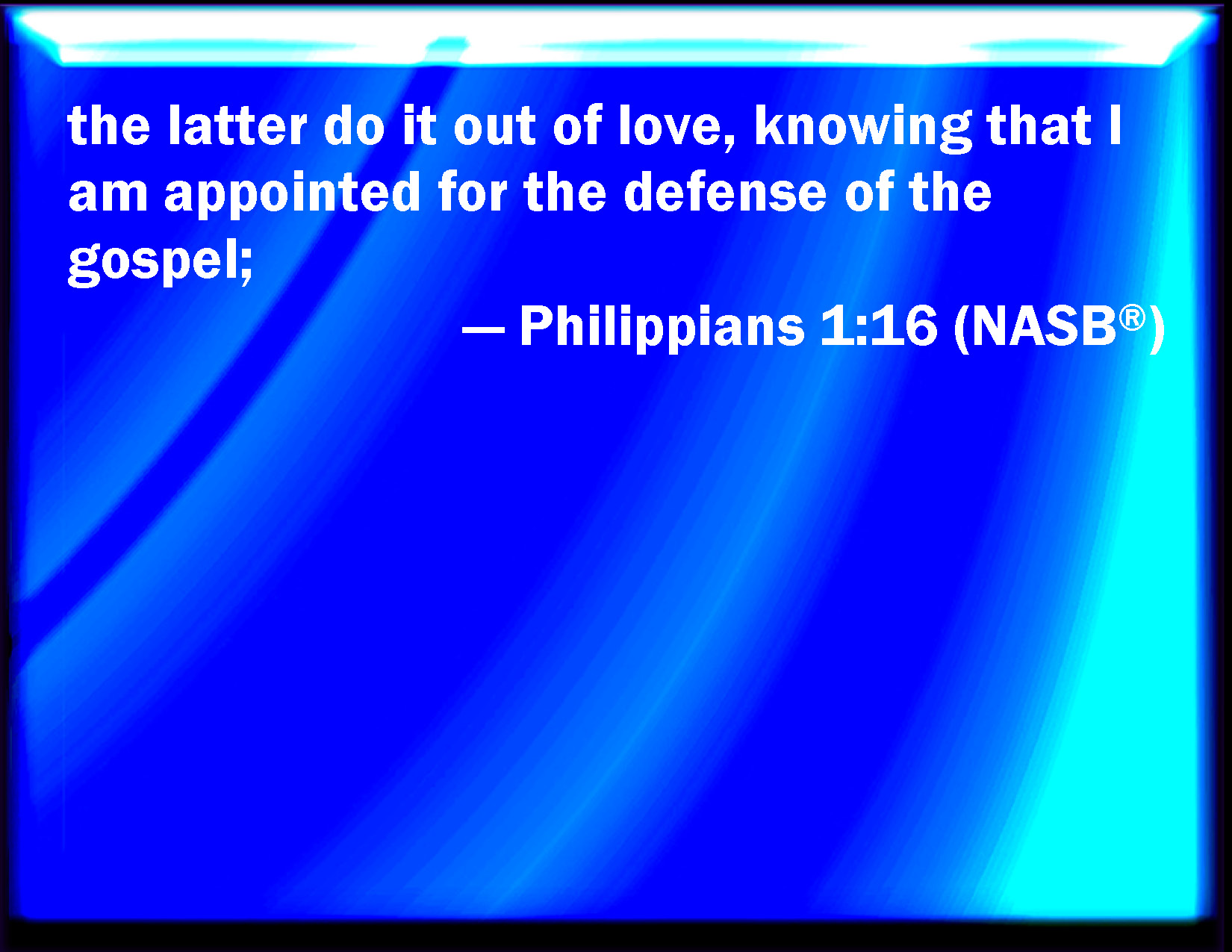 Bible Verse Slide Philippians 1:16 The one preach Christ of contention, not sincerely, supposing to add affliction to my bonds: KJV: The one preach Christ of contention, not sincerely, supposing to add affliction to my bonds: DRB: Some out of charity, knowing that I am set for the defence of the gospel. DBT: These indeed out of love, knowing that I am set for the defence of the glad tidings; ERV: the one do it of love, knowing that I am set for the defence of the gospel: WBT: The one preach Christ from contention, not sincerely, supposing to add affliction to my bonds: WEB: The former insincerely preach Christ from selfish ambition, thinking that they add affliction to my chains; YLT: the one, indeed, of rivalry the Christ do proclaim, not purely, supposing to add affliction to my bonds,Links Philippians 1:16 NIV • Philippians 1:16 NLT • Philippians 1:16 ESV • Philippians 1:16 NASB • Philippians 1:16 KJV • Philippians 1:16 Interlinear • Philippians 1:16 Commentaries • Philippians 1:16 Parallel Texts • Philippians 1:16 Bible Apps • Philippians 1:16 Parallel • Bible Hub |