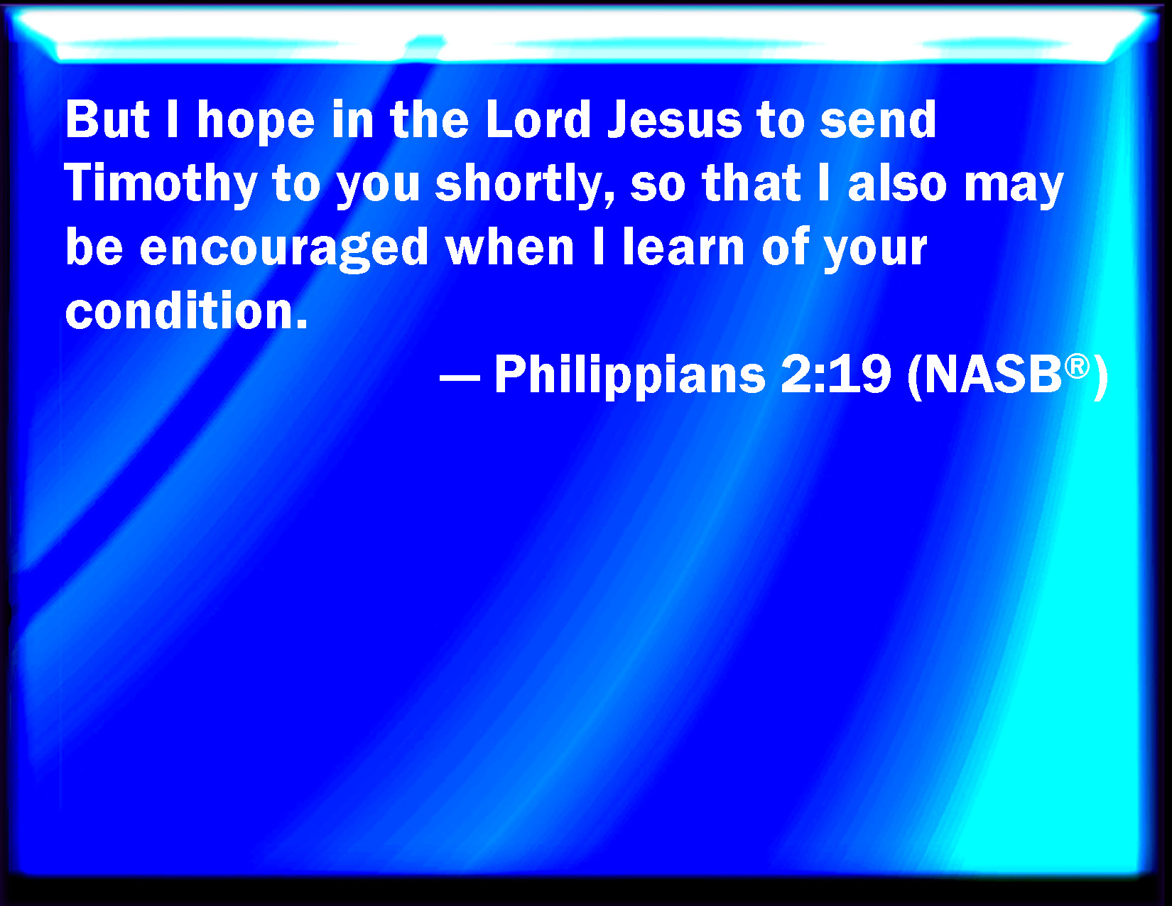 Bible Verse Slide Philippians 2:19 But I trust in the Lord Jesus to send Timotheus shortly to you, that I also may be of good comfort, when I know your state. KJV: But I trust in the Lord Jesus to send Timotheus shortly unto you, that I also may be of good comfort, when I know your state. DRB: And I hope in the Lord Jesus to send Timothy unto you shortly, that I also may be of good comfort, when I know the things concerning you. DBT: But I hope in the Lord Jesus to send Timotheus to you shortly, that I also may be refreshed, knowing how ye get on. ERV: But I hope in the Lord Jesus to send Timothy shortly unto you, that I also may be of good comfort, when I know your state. WBT: But I trust in the Lord Jesus to send Timothy shortly to you, that I also may be of good comfort, when I know your state. WEB: But I hope in the Lord Jesus to send Timothy to you soon, that I also may be cheered up when I know how you are doing. YLT: And I hope, in the Lord Jesus, Timotheus to send quickly to you, that I also may be of good spirit, having known the things concerning you,Links Philippians 2:19 NIV • Philippians 2:19 NLT • Philippians 2:19 ESV • Philippians 2:19 NASB • Philippians 2:19 KJV • Philippians 2:19 Interlinear • Philippians 2:19 Commentaries • Philippians 2:19 Parallel Texts • Philippians 2:19 Bible Apps • Philippians 2:19 Parallel • Bible Hub |