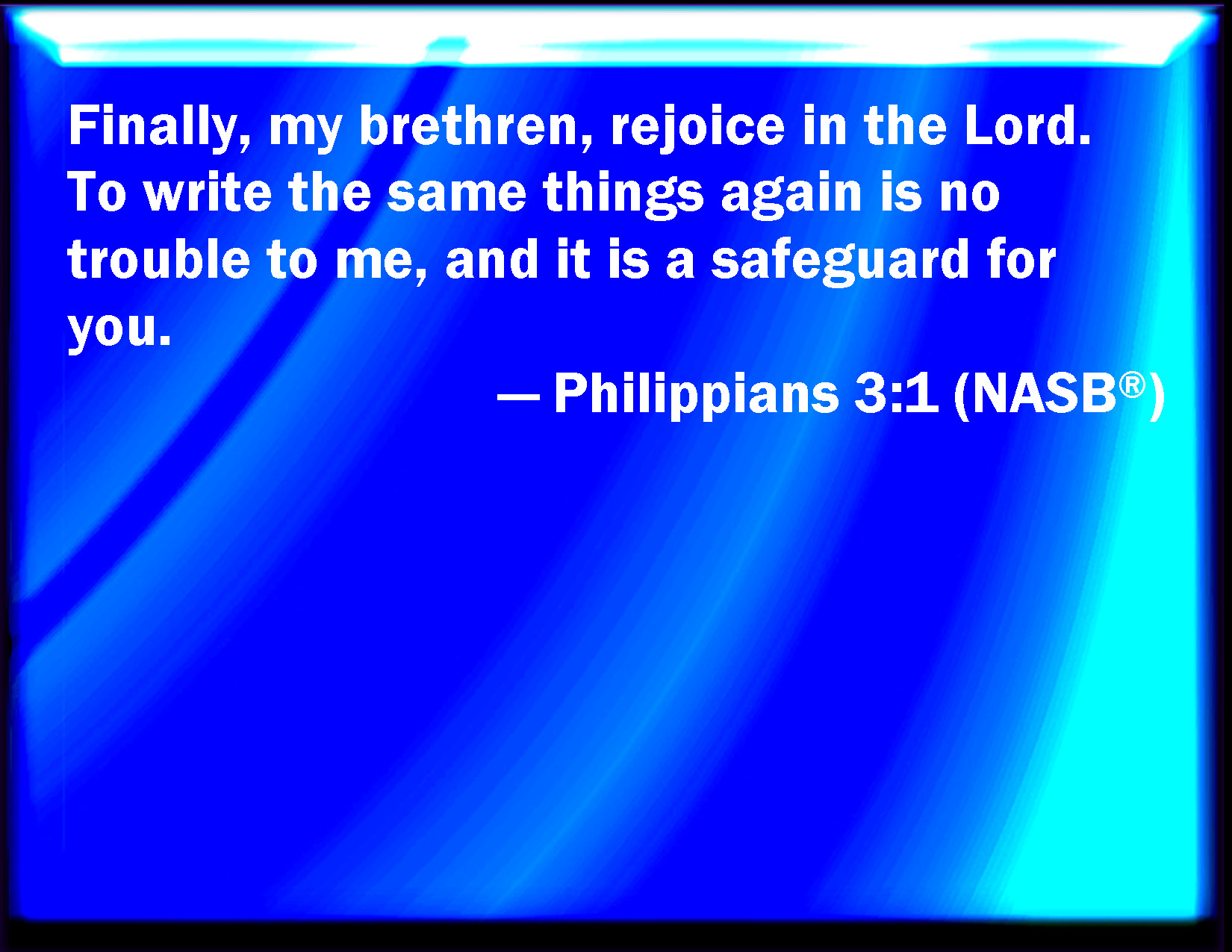 Bible Verse Slide Philippians 3:1 Finally, my brothers, rejoice in the Lord. To write the same things to you, to me indeed is not grievous, but for you it is safe. KJV: Finally, my brethren, rejoice in the Lord. To write the same things to you, to me indeed is not grievous, but for you it is safe. DRB: As to the rest, my brethren, rejoice in the Lord. To write the same things to you, to me indeed is not wearisome, but to you it is necessary. DBT: For the rest, my brethren, rejoice in the Lord: to write the same things to you, to me is not irksome, and for you safe. ERV: Finally, my brethren, rejoice in the Lord. To write the same things to you, to me indeed is not irksome, but for you it is safe. WBT: Finally, my brethren, rejoice in the Lord. To write the same things to you, to me indeed is not grievous, but for you it is safe. WEB: Finally, my brothers, rejoice in the Lord. To write the same things to you, to me indeed is not tiresome, but for you it is safe. YLT: As to the rest, my brethren, rejoice in the Lord; the same things to write to you to me indeed is not tiresome, and for you is sure;Links Philippians 3:1 NIV • Philippians 3:1 NLT • Philippians 3:1 ESV • Philippians 3:1 NASB • Philippians 3:1 KJV • Philippians 3:1 Interlinear • Philippians 3:1 Commentaries • Philippians 3:1 Parallel Texts • Philippians 3:1 Bible Apps • Philippians 3:1 Parallel • Bible Hub |