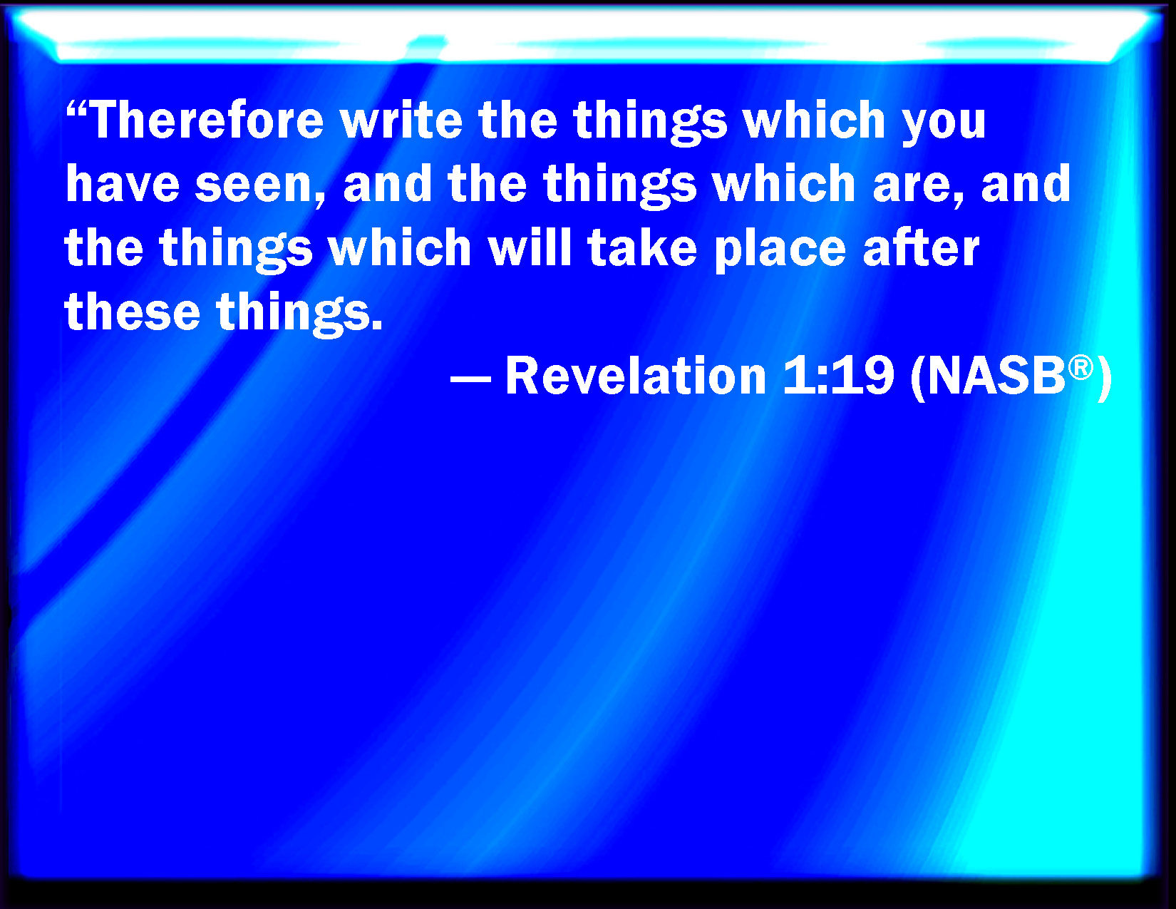 Bible Verse Slide Revelation 1:19 Write the things which you have seen, and the things which are, and the things which shall be hereafter; KJV: Write the things which thou hast seen, and the things which are, and the things which shall be hereafter; DRB: Write therefore the things which thou hast seen, and which are, and which must be done hereafter. DBT: Write therefore what thou hast seen, and the things that are, and the things that are about to be after these. ERV: Write therefore the things which thou sawest, and the things which are, and the things which shall come to pass hereafter; WBT: Write the things which thou hast seen, and the things which are, and the things which shall be hereafter; WEB: Write therefore the things which you have seen, and the things which are, and the things which will happen hereafter; YLT: 'Write the things that thou hast seen, and the things that are, and the things that are about to come after these things;Links Revelation 1:19 NIV • Revelation 1:19 NLT • Revelation 1:19 ESV • Revelation 1:19 NASB • Revelation 1:19 KJV • Revelation 1:19 Interlinear • Revelation 1:19 Commentaries • Revelation 1:19 Parallel Texts • Revelation 1:19 Bible Apps • Revelation 1:19 Parallel • Bible Hub |