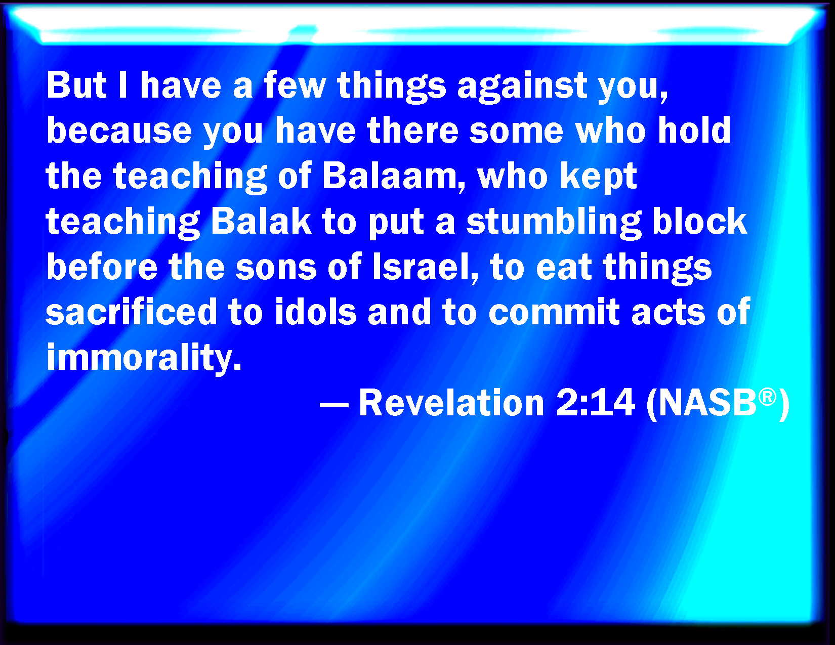 Bible Verse Slide Revelation 2:14 But I have a few things against you, because you have there them that hold the doctrine of Balaam, who taught Balac to cast a stumbling block before the children of Israel, to eat things sacrificed to idols, and to commit fornication. KJV: But I have a few things against thee, because thou hast there them that hold the doctrine of Balaam, who taught Balac to cast a stumblingblock before the children of Israel, to eat things sacrificed unto idols, and to commit fornication. DRB: But I have against thee a few things: because thou hast there them that hold the doctrine of Balaam, who taught Balac to cast a stumblingblock before the children of Israel, to eat, and to commit fornication: DBT: But I have a few things against thee: that thou hast there those who hold the doctrine of Balaam, who taught Balak to cast a snare before the sons of Israel, to eat of idol sacrifices and commit fornication. ERV: But I have a few things against thee, because thou hast there some that hold the teaching of Balaam, who taught Balak to cast a stumblingblock before the children of Israel, to eat things sacrificed to idols, and to commit fornication. WBT: But I have a few things against thee, because thou hast there them that hold the doctrine of Balaam, who taught Balak to cast a stumbling-block before the children of Israel, to eat things sacrificed to idols, and to commit lewdness. WEB: But I have a few things against you, because you have there some who hold the teaching of Balaam, who taught Balak to throw a stumbling block before the children of Israel, to eat things sacrificed to idols, and to commit sexual immorality. YLT: 'But I have against thee a few things: That thou hast there those holding the teaching of Balaam, who did teach Balak to cast a stumbling-block before the sons of Israel, to eat idol-sacrifices, and to commit whoredom;Links Revelation 2:14 NIV • Revelation 2:14 NLT • Revelation 2:14 ESV • Revelation 2:14 NASB • Revelation 2:14 KJV • Revelation 2:14 Interlinear • Revelation 2:14 Commentaries • Revelation 2:14 Parallel Texts • Revelation 2:14 Bible Apps • Revelation 2:14 Parallel • Bible Hub |