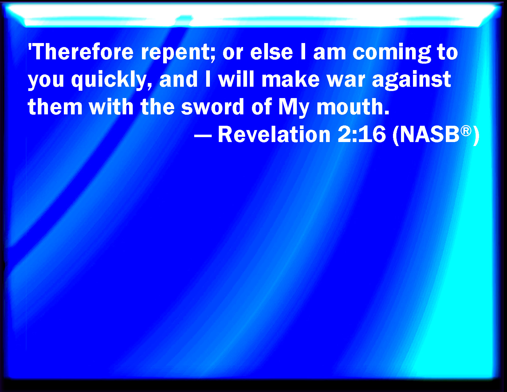 Bible Verse Slide Revelation 2:16 Repent; or else I will come to you quickly, and will fight against them with the sword of my mouth. KJV: Repent; or else I will come unto thee quickly, and will fight against them with the sword of my mouth. DRB: In like manner do penance: if not, I will come to thee quickly, and will fight against them with the sword of my mouth. DBT: Repent therefore: but if not, I come to thee quickly, and I will make war with them with the sword of my mouth. ERV: Repent therefore; or else I come to thee quickly, and I will make war against them with the sword of my mouth. WBT: Repent; or else I will come to thee quickly, and will fight against them with the sword of my mouth. WEB: Repent therefore, or else I am coming to you quickly, and I will make war against them with the sword of my mouth. YLT: 'Reform! and if not, I come to thee quickly, and will fight against them with the sword of my mouth.Links Revelation 2:16 NIV • Revelation 2:16 NLT • Revelation 2:16 ESV • Revelation 2:16 NASB • Revelation 2:16 KJV • Revelation 2:16 Interlinear • Revelation 2:16 Commentaries • Revelation 2:16 Parallel Texts • Revelation 2:16 Bible Apps • Revelation 2:16 Parallel • Bible Hub |