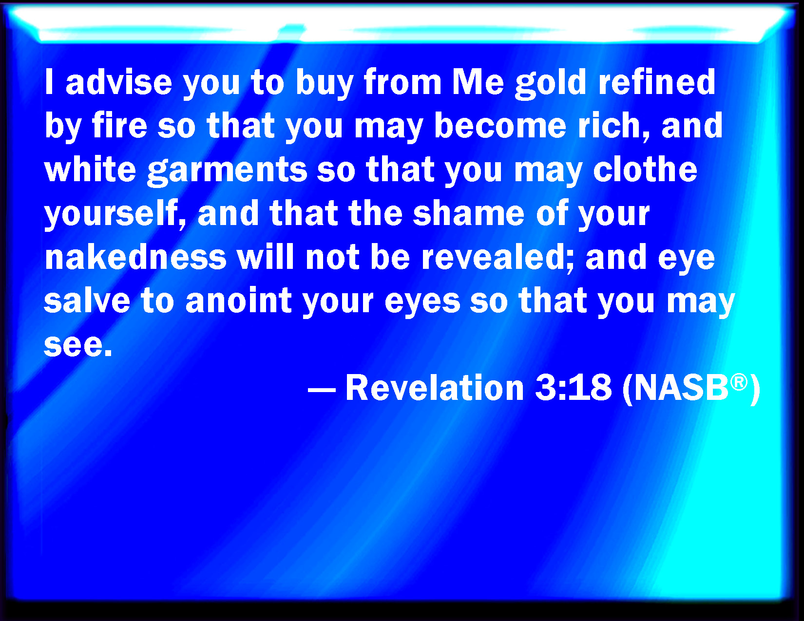 Bible Verse Slide Revelation 3:18 I counsel you to buy of me gold tried in the fire, that you may be rich; and white raiment, that you may be clothed, and that the shame of your nakedness do not appear; and anoint your eyes with eye salve, that you may see. KJV: I counsel thee to buy of me gold tried in the fire, that thou mayest be rich; and white raiment, that thou mayest be clothed, and that the shame of thy nakedness do not appear; and anoint thine eyes with eyesalve, that thou mayest see. DRB: I counsel thee to buy of me gold fire tried, that thou mayest be made rich; and mayest be clothed in white garments, and that the shame of thy nakedness may not appear; and anoint thy eyes with eyesalve, that thou mayest see. DBT: I counsel thee to buy of me gold purified by fire, that thou mayest be rich; and white garments, that thou mayest be clothed, and that the shame of thy nakedness may not be made manifest; and eye-salve to anoint thine eyes, that thou mayest see. ERV: I counsel thee to buy of me gold refined by fire, that thou mayest become rich; and white garments, that thou mayest clothe thyself, and that the shame of thy nakedness be not made manifest; and eyesalve to anoint thine eyes, that thou mayest see. WBT: I counsel thee to buy of me gold tried in the fire, that thou mayest be rich; and white raiment, that thou mayest be clothed, and that the shame of thy nakedness may not appear; and anoint thy eyes with eye-salve, that thou mayest see. WEB: I counsel you to buy from me gold refined by fire, that you may become rich; and white garments, that you may clothe yourself, and that the shame of your nakedness may not be revealed; and eye salve to anoint your eyes, that you may see. YLT: I counsel thee to buy from me gold fired by fire, that thou mayest be rich, and white garments that thou mayest be arrayed, and the shame of thy nakedness may not be manifest, and with eye-salve anoint thine eyes, that thou mayest see.Links Revelation 3:18 NIV • Revelation 3:18 NLT • Revelation 3:18 ESV • Revelation 3:18 NASB • Revelation 3:18 KJV • Revelation 3:18 Interlinear • Revelation 3:18 Commentaries • Revelation 3:18 Parallel Texts • Revelation 3:18 Bible Apps • Revelation 3:18 Parallel • Bible Hub |