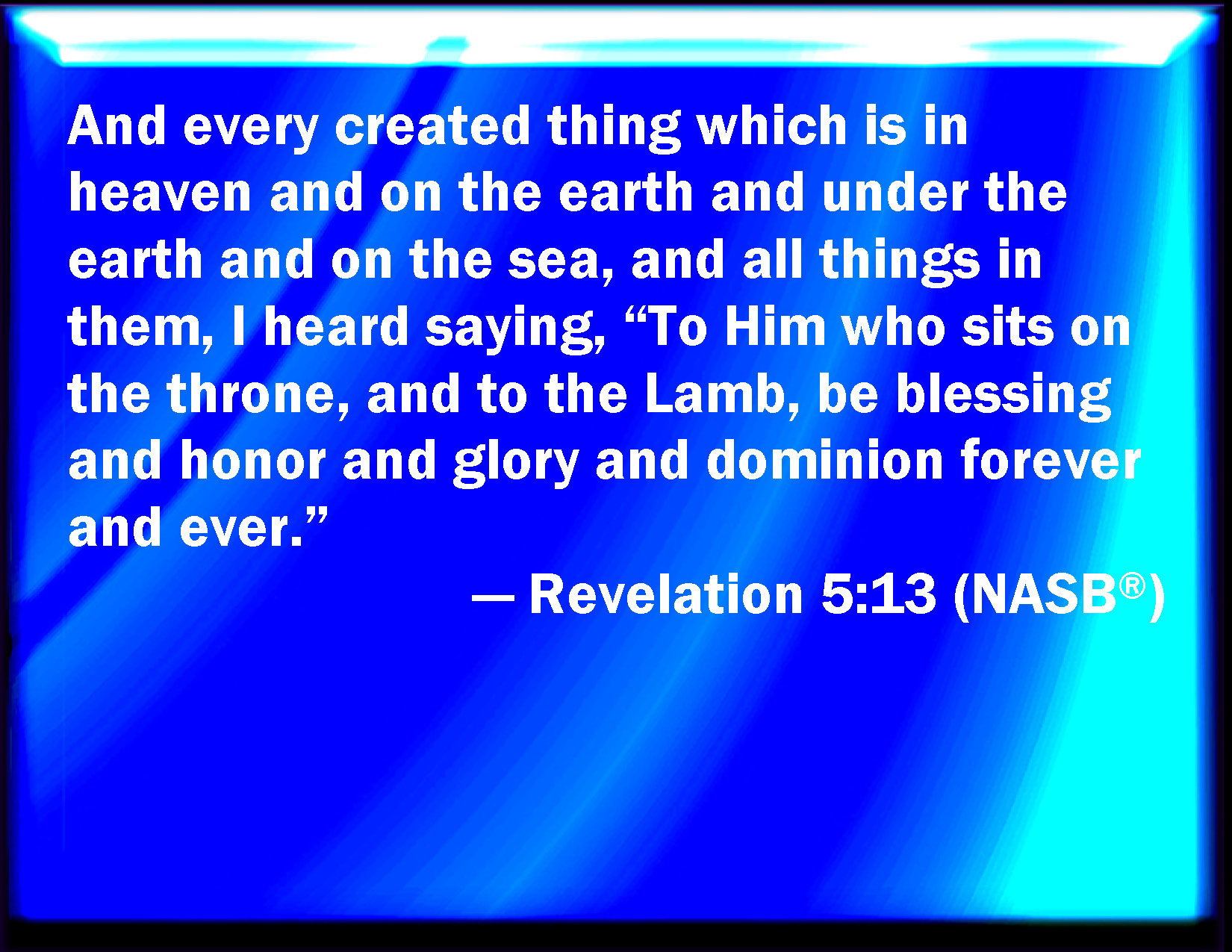 Bible Verse Slide Revelation 5:13 And every creature which is in heaven, and on the earth, and under the earth, and such as are in the sea, and all that are in them, heard I saying, Blessing, and honor, and glory, and power, be to him that sits on the throne, and to the Lamb for ever and ever. KJV: And every creature which is in heaven, and on the earth, and under the earth, and such as are in the sea, and all that are in them, heard I saying, Blessing, and honour, and glory, and power, be unto him that sitteth upon the throne, and unto the Lamb for ever and ever. DRB: And every creature, which is in heaven, and on the earth, and under the earth, and such as are in the sea, and all that are in them: I heard all saying: To him that sitteth on the throne, and to the Lamb, benediction, and honour, and glory, and power, for ever and ever. DBT: And every creature which is in the heaven and upon the earth and under the earth, and those that are upon the sea, and all things in them, heard I saying, To him that sits upon the throne, and to the Lamb, blessing, and honour, and glory, and might, to the ages of ages. ERV: And every created thing which is in the heaven, and on the earth, and under the earth, and on the sea, and all things that are in them, heard I saying, Unto him that sitteth on the throne, and unto the Lamb, be the blessing, and the honour, and the glory, and the dominion, for ever and ever. WBT: And every creature which is in heaven, and on the earth, and under the earth, and such as are in the sea, and all that are in them, I heard saying, Blessing, and honor, and glory, and power, be to him that sitteth upon the throne, and to the Lamb for ever and ever. WEB: I heard every created thing which is in heaven, on the earth, under the earth, on the sea, and everything in them, saying, "To him who sits on the throne, and to the Lamb be the blessing, the honor, the glory, and the dominion, forever and ever! Amen!" YLT: and every creature that is in the heaven, and in the earth, and under the earth, and the things that are upon the sea, and the all things in them, heard I saying, 'To Him who is sitting upon the throne, and to the Lamb, is the blessing, and the honour, and the glory, and the might — to the ages of the ages!'Links Revelation 5:13 NIV • Revelation 5:13 NLT • Revelation 5:13 ESV • Revelation 5:13 NASB • Revelation 5:13 KJV • Revelation 5:13 Interlinear • Revelation 5:13 Commentaries • Revelation 5:13 Parallel Texts • Revelation 5:13 Bible Apps • Revelation 5:13 Parallel • Bible Hub |