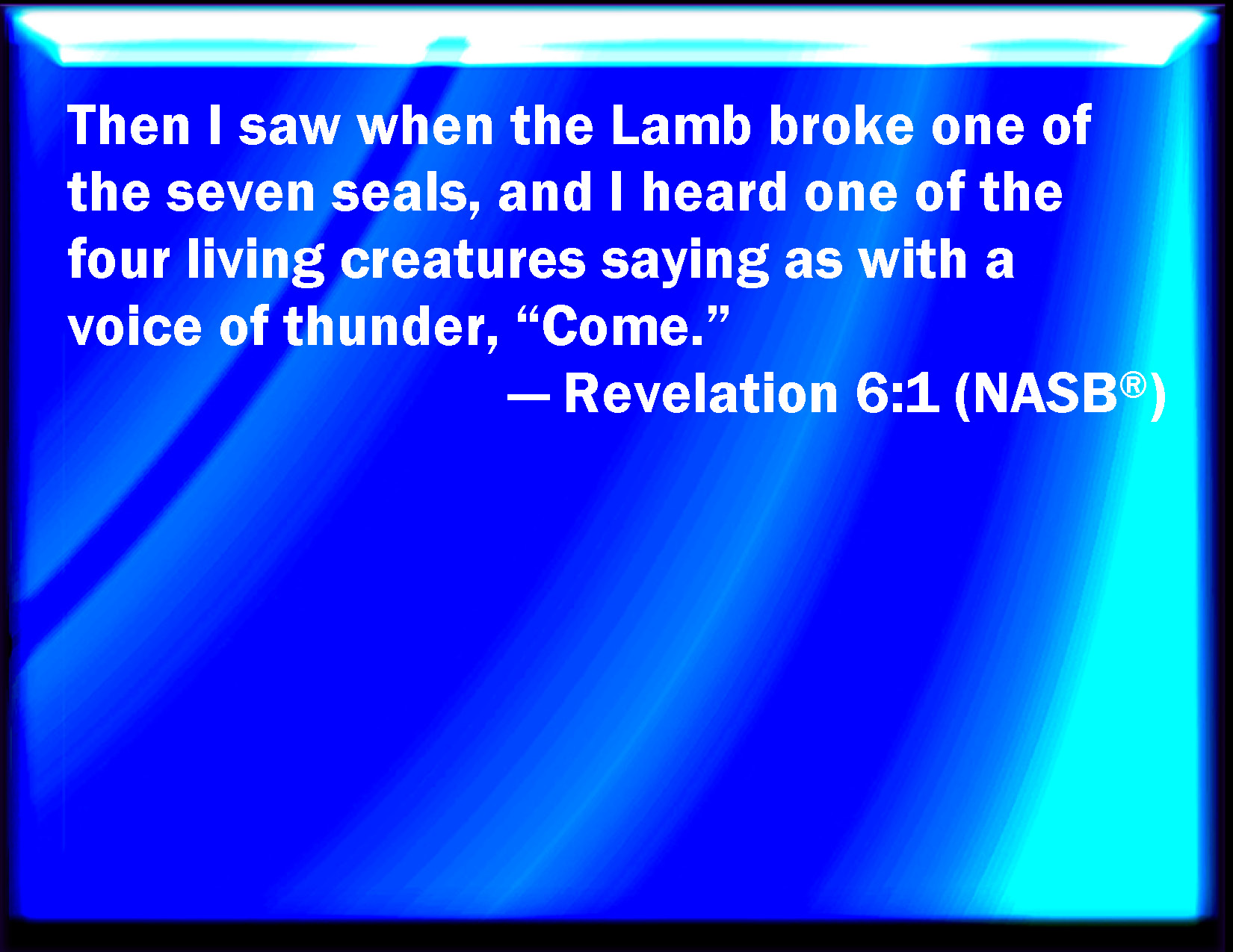 Bible Verse Slide Revelation 6:1 And I saw when the Lamb opened one of the seals, and I heard, as it were the noise of thunder, one of the four beasts saying, Come and see. KJV: And I saw when the Lamb opened one of the seals, and I heard, as it were the noise of thunder, one of the four beasts saying, Come and see. DRB: And I saw that the Lamb had opened one of the seven seals, and I heard one of the four living creatures, as it were the voice of thunder, saying: Come, and see. DBT: And I saw when the Lamb opened one of the seven seals, and I heard one of the four living creatures saying, as a voice of thunder, Come and see. ERV: And I saw when the Lamb opened one of the seven seals, and I heard one of the four living creatures saying as with a voice of thunder, Come. WBT: And I saw when the Lamb opened one of the seals, and I heard, as it were the noise of thunder, one of the four living beings saying, Come and see. WEB: I saw that the Lamb opened one of the seven seals, and I heard one of the four living creatures saying, as with a voice of thunder, "Come and see!" YLT: And I saw when the Lamb opened one of the seals, and I heard one of the four living creatures saying, as it were a voice of thunder, 'Come and behold!'Links Revelation 6:1 NIV • Revelation 6:1 NLT • Revelation 6:1 ESV • Revelation 6:1 NASB • Revelation 6:1 KJV • Revelation 6:1 Interlinear • Revelation 6:1 Commentaries • Revelation 6:1 Parallel Texts • Revelation 6:1 Bible Apps • Revelation 6:1 Parallel • Bible Hub |