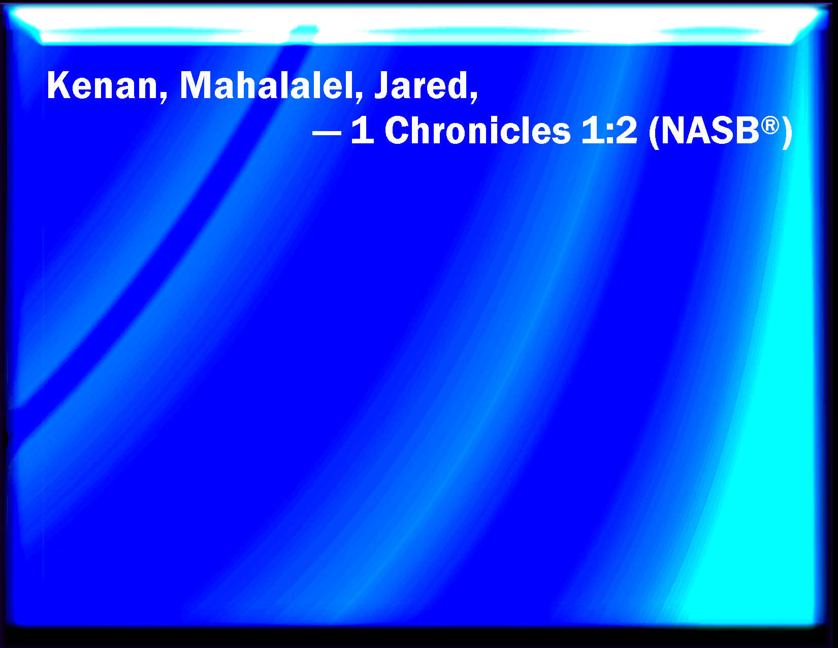 Bible Verse Slide 1 Chronicles 1:2 Kenan, Mahalaleel, Jered, KJV: Kenan, Mahalaleel, Jered, DRB: Cainan, Malaleel, Jared, DBT: Cainan, Mahalaleel, Jared, ERV: Kenan, Mahalalel, Jared; WBT: Kenan, Mahalaleel, Jered, WEB: Kenan, Mahalalel, Jared, YLT: Kenan, Mahalaleel, Jered,Links 1 Chronicles 1:2 NIV • 1 Chronicles 1:2 NLT • 1 Chronicles 1:2 ESV • 1 Chronicles 1:2 NASB • 1 Chronicles 1:2 KJV • 1 Chronicles 1:2 Interlinear • 1 Chronicles 1:2 Commentaries • 1 Chronicles 1:2 Parallel Texts • 1 Chronicles 1:2 Bible Apps • 1 Chronicles 1:2 Parallel • Bible Hub |
