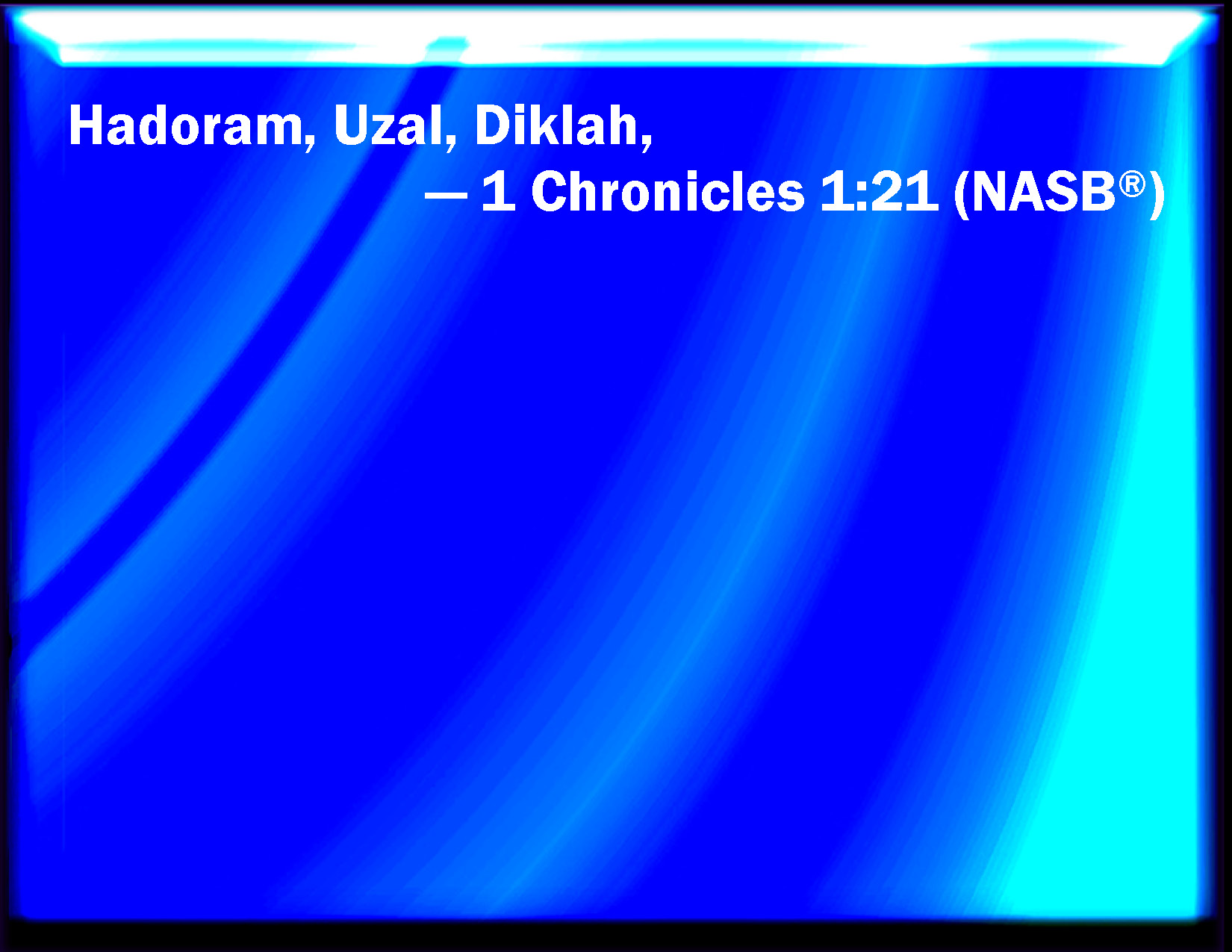 Bible Verse Slide 1 Chronicles 1:21 Hadoram also, and Uzal, and Diklah, KJV: Hadoram also, and Uzal, and Diklah, DRB: And Adoram, and Usal, and Decla, DBT: and Hadoram, and Uzal, and Diklah, ERV: and Hadoram, and Uzal, and Diklah; WBT: Hadoram also, and Uzal, and Diklah, WEB: and Hadoram, and Uzal, and Diklah, YLT: and Hadoram, and Uzal, and Diklah,Links 1 Chronicles 1:21 NIV • 1 Chronicles 1:21 NLT • 1 Chronicles 1:21 ESV • 1 Chronicles 1:21 NASB • 1 Chronicles 1:21 KJV • 1 Chronicles 1:21 Interlinear • 1 Chronicles 1:21 Commentaries • 1 Chronicles 1:21 Parallel Texts • 1 Chronicles 1:21 Bible Apps • 1 Chronicles 1:21 Parallel • Bible Hub |
