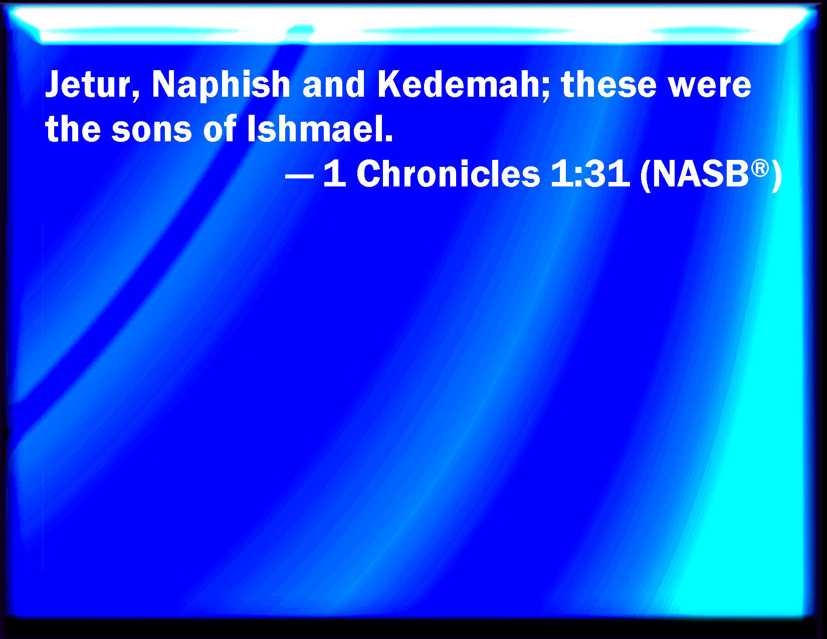 Bible Verse Slide 1 Chronicles 1:31 Jetur, Naphish, and Kedemah. These are the sons of Ishmael. KJV: Jetur, Naphish, and Kedemah. These are the sons of Ishmael. DRB: Jetur, Naphis, Cedma: these are the sons of Ismahel. DBT: Jetur, Naphish, and Kedmah: those are the sons of Ishmael. ERV: Jetur, Naphish, and Kedemah. These are the sons of Ishmael. WBT: Jetur, Naphish, and Kedemah. These are the sons of Ishmael. WEB: Jetur, Naphish, and Kedemah. These are the sons of Ishmael. YLT: Jetur, Naphish, and Kedema. These are sons of Ishmael.Links 1 Chronicles 1:31 NIV • 1 Chronicles 1:31 NLT • 1 Chronicles 1:31 ESV • 1 Chronicles 1:31 NASB • 1 Chronicles 1:31 KJV • 1 Chronicles 1:31 Interlinear • 1 Chronicles 1:31 Commentaries • 1 Chronicles 1:31 Parallel Texts • 1 Chronicles 1:31 Bible Apps • 1 Chronicles 1:31 Parallel • Bible Hub |