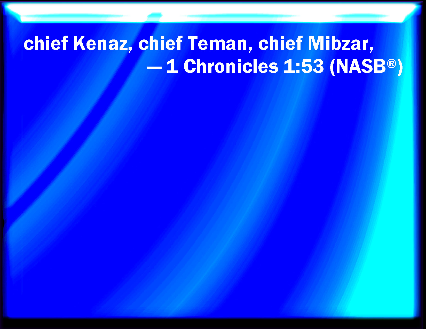 Bible Verse Slide 1 Chronicles 1:53 Duke Kenaz, duke Teman, duke Mibzar, KJV: Duke Kenaz, duke Teman, duke Mibzar, DRB: 53Duke Cenez, duke Theman, duke Mabsar, DBT: chief Kenaz, chief Teman, chief Mibzar, ERV: duke Kenaz, duke Teman, duke Mibzar; WBT: Duke Kenaz, duke Teman, duke Mibzar, WEB: chief Kenaz, chief Teman, chief Mibzar, YLT: chief Kenaz, chief Teman, chief Mibzar,Links 1 Chronicles 1:53 NIV • 1 Chronicles 1:53 NLT • 1 Chronicles 1:53 ESV • 1 Chronicles 1:53 NASB • 1 Chronicles 1:53 KJV • 1 Chronicles 1:53 Interlinear • 1 Chronicles 1:53 Commentaries • 1 Chronicles 1:53 Parallel Texts • 1 Chronicles 1:53 Bible Apps • 1 Chronicles 1:53 Parallel • Bible Hub |