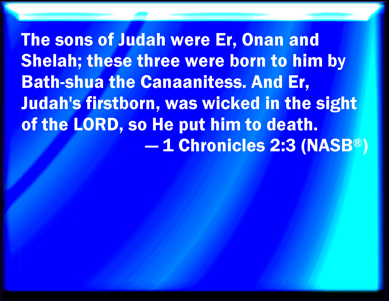 Bible Verse Slide 1 Chronicles 2:3 The sons of Judah; Er, and Onan, and Shelah: which three were born to him of the daughter of Shua the Canaanitess. And Er, the firstborn of Judah, was evil in the sight of the LORD; and he slew him. KJV: The sons of Judah; Er, and Onan, and Shelah: which three were born unto him of the daughter of Shua the Canaanitess. And Er, the firstborn of Judah, was evil in the sight of the LORD; and he slew him. DRB: The sons of Juda: Her, Onan and Sela. These three were born to him of the Chanaanitess the daughter of Sue. And Her the firstborn of Juda, was wicked in the sight of the Lord, and he slew him. DBT: The sons of Judah: Er, and Onan, and Shelah: which three were born to him of the daughter of Shua the Canaanitess. And Er, Judah's firstborn, was wicked in the sight of Jehovah; and he slew him. ERV: The sons of Judah; Er, and Onan, and Shelah: which three were born unto him of Bath-shua the Canaanitess. And Er, Judah's firstborn, was wicked in the sight of the LORD; and he slew him. WBT: The sons of Judah; Er, and Onan, and Shelah: which three were born to him of the daughter of Shua the Canaanitess. And Er, the first-born of Judah, was evil in the sight of the LORD; and he slew him. WEB: The sons of Judah: Er, and Onan, and Shelah; which three were born to him of Shua's daughter the Canaanitess. Er, Judah's firstborn, was wicked in the sight of Yahweh; and he killed him. YLT: Sons of Judah: Er, and Onan, and Shelah, three have been born to him of a daughter of Shua the Canaanitess. And Er, first-born of Judah, is evil in the eyes of Jehovah, and He putteth him to death.Links 1 Chronicles 2:3 NIV • 1 Chronicles 2:3 NLT • 1 Chronicles 2:3 ESV • 1 Chronicles 2:3 NASB • 1 Chronicles 2:3 KJV • 1 Chronicles 2:3 Interlinear • 1 Chronicles 2:3 Commentaries • 1 Chronicles 2:3 Parallel Texts • 1 Chronicles 2:3 Bible Apps • 1 Chronicles 2:3 Parallel • Bible Hub |