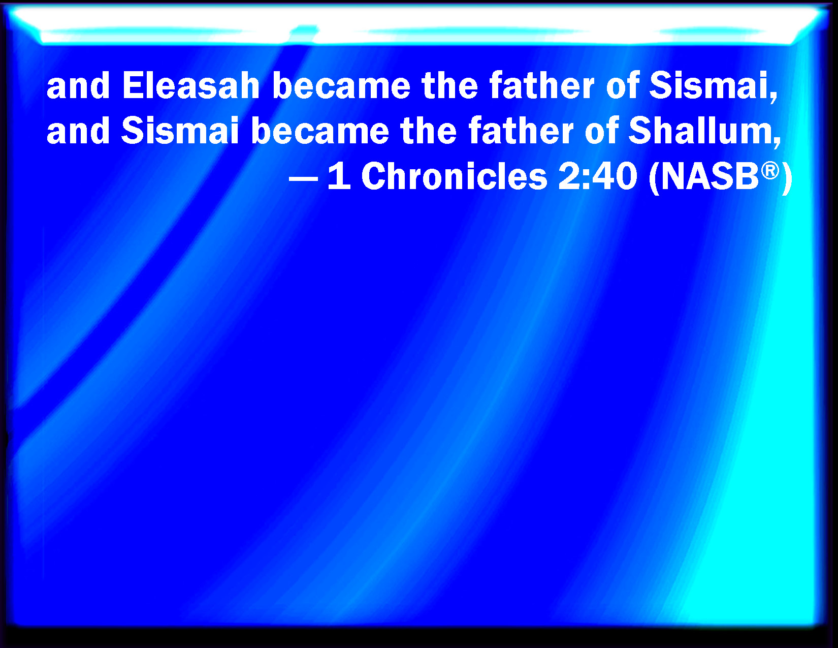 Bible Verse Slide 1 Chronicles 2:40 And Eleasah begat Sisamai, and Sisamai begat Shallum, KJV: And Eleasah begat Sisamai, and Sisamai begat Shallum, DRB: Elasa beget Sisamoi, Sisamoi beget Sellum, DBT: and Elasah begot Sismai, and Sismai begot Shallum, ERV: and Eleasah begat Sismai, and Sismai begat Shallum; WBT: And Eleasah begat Sisamai, and Sisamai begat Shallum, WEB: and Eleasah became the father of Sismai, and Sismai became the father of Shallum, YLT: and Eleasah begat Sismai, and Sismai begat Shallum,Links 1 Chronicles 2:40 NIV • 1 Chronicles 2:40 NLT • 1 Chronicles 2:40 ESV • 1 Chronicles 2:40 NASB • 1 Chronicles 2:40 KJV • 1 Chronicles 2:40 Interlinear • 1 Chronicles 2:40 Commentaries • 1 Chronicles 2:40 Parallel Texts • 1 Chronicles 2:40 Bible Apps • 1 Chronicles 2:40 Parallel • Bible Hub |