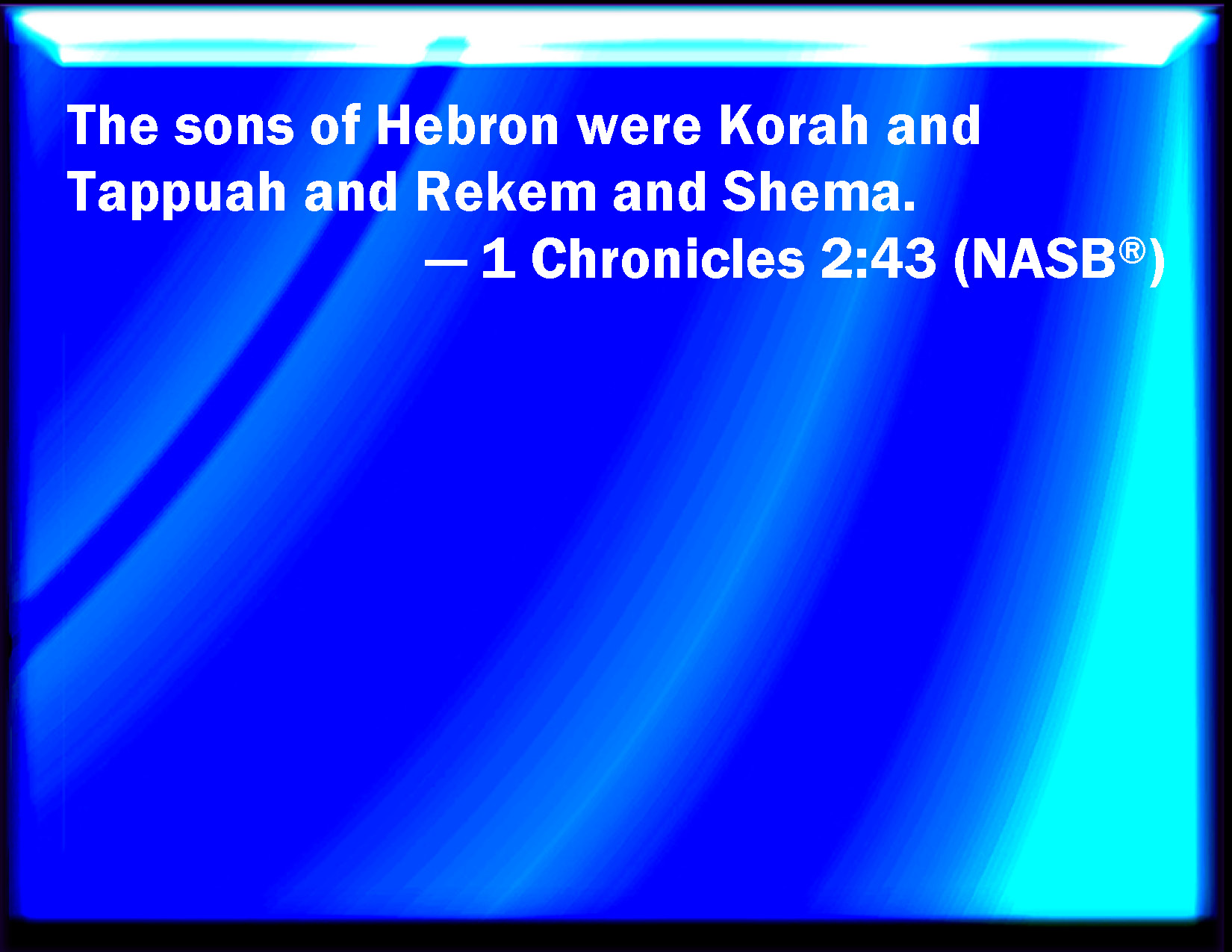 Bible Verse Slide 1 Chronicles 2:43 And the sons of Hebron; Korah, and Tappuah, and Rekem, and Shema. KJV: And the sons of Hebron; Korah, and Tappuah, and Rekem, and Shema. DRB: And the sons of Hebron, Core, and Thaphua, and Recem, and Samma. DBT: And the sons of Hebron: Korah, and Tappuah, and Rekem, and Shema. ERV: And the sons of Hebron; Korah, and Tappuah, and Rekem, and Shema. WBT: And the sons of Hebron; Korah, and Tappuah, and Rekem, and Shema. WEB: The sons of Hebron: Korah, and Tappuah, and Rekem, and Shema. YLT: And sons of Hebron: Korah, and Tappuah, and Rekem, and Shema.Links 1 Chronicles 2:43 NIV • 1 Chronicles 2:43 NLT • 1 Chronicles 2:43 ESV • 1 Chronicles 2:43 NASB • 1 Chronicles 2:43 KJV • 1 Chronicles 2:43 Interlinear • 1 Chronicles 2:43 Commentaries • 1 Chronicles 2:43 Parallel Texts • 1 Chronicles 2:43 Bible Apps • 1 Chronicles 2:43 Parallel • Bible Hub |