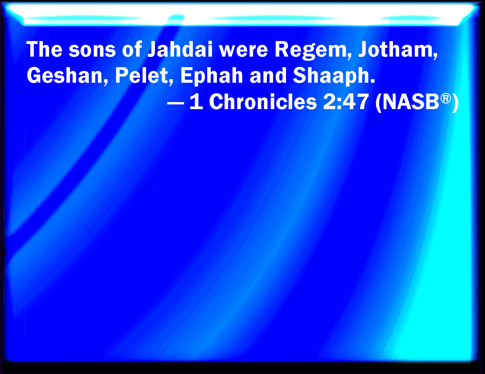 Bible Verse Slide 1 Chronicles 2:47 And the sons of Jahdai; Regem, and Jotham, and Gesham, and Pelet, and Ephah, and Shaaph. KJV: And the sons of Jahdai; Regem, and Jotham, and Geshan, and Pelet, and Ephah, and Shaaph. DRB: And the sons of Jahaddai, Rogom, and Joathan, and Gesan, and Phalet, and Epha, and Saaph. DBT: And the sons of Jehdai: Regem, and Jotham, and Geshan, and Pelet, and Ephah, and Shaaph. ERV: And the sons of Jahdai; Regem, and Jotham, and Geshan, and Pelet, and Ephah, and Shaaph. WBT: And the sons of Jahdai; Regem, and Jotham, and Geshan, and Pelet, and Ephah, and Shaaph. WEB: The sons of Jahdai: Regem, and Jothan, and Geshan, and Pelet, and Ephah, and Shaaph. YLT: And sons of Jahdai: Regem, and Jotham, and Geshem, and Pelet, and Ephah, and Shaaph.Links 1 Chronicles 2:47 NIV • 1 Chronicles 2:47 NLT • 1 Chronicles 2:47 ESV • 1 Chronicles 2:47 NASB • 1 Chronicles 2:47 KJV • 1 Chronicles 2:47 Interlinear • 1 Chronicles 2:47 Commentaries • 1 Chronicles 2:47 Parallel Texts • 1 Chronicles 2:47 Bible Apps • 1 Chronicles 2:47 Parallel • Bible Hub |