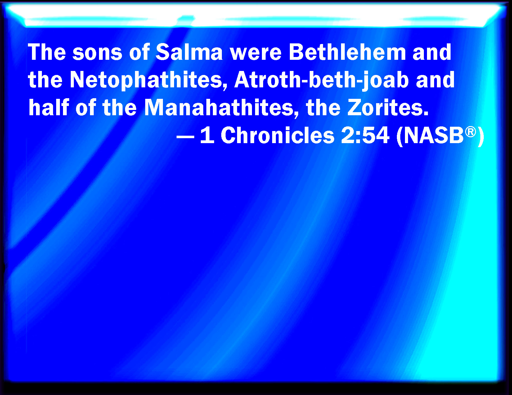 Bible Verse Slide 1 Chronicles 2:54 The sons of Salma; Bethlehem, and the Netophathites, Ataroth, the house of Joab, and half of the Manahethites, the Zorites. KJV: The sons of Salma; Bethlehem, and the Netophathites, Ataroth, the house of Joab, and half of the Manahethites, the Zorites. DRB: The sons of Salma, Bethlehem, and Netophathi, the crowns of the house of Joab, and half of the place of rest of Sarai. DBT: The sons of Salma: Bethlehem, and the Netophathites. Atroth-Beth-Joab, and the Hazi-Hammana-hethites, the Zorites; ERV: The sons of Salma; Beth-lehem, the Netophathites, Atroth-beth-Joab, and half of the Manahathites, the Zorites. WBT: The sons of Salma; Beth-lehem, and the Netophathites, Ataroth, the house of Joab, and half of the Menahethites, the Zorites. WEB: The sons of Salma: Bethlehem, and the Netophathites, Atroth Beth Joab, and half of the Manahathites, the Zorites. YLT: Sons of Salma: Beth-Lehem, and the Netophathite, Atroth, Beth-Joab, and half of the Menuhothite, the Zorite;Links 1 Chronicles 2:54 NIV • 1 Chronicles 2:54 NLT • 1 Chronicles 2:54 ESV • 1 Chronicles 2:54 NASB • 1 Chronicles 2:54 KJV • 1 Chronicles 2:54 Interlinear • 1 Chronicles 2:54 Commentaries • 1 Chronicles 2:54 Parallel Texts • 1 Chronicles 2:54 Bible Apps • 1 Chronicles 2:54 Parallel • Bible Hub |