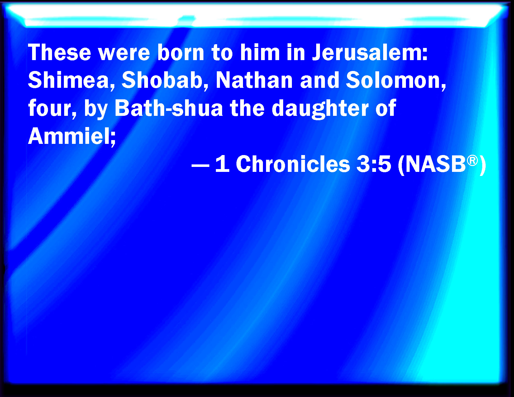 Bible Verse Slide 1 Chronicles 3:5 And these were born to him in Jerusalem; Shimea, and Shobab, and Nathan, and Solomon, four, of Bathshua the daughter of Ammiel: KJV: And these were born unto him in Jerusalem; Shimea, and Shobab, and Nathan, and Solomon, four, of Bathshua the daughter of Ammiel: DRB: And these sons were born to him in Jerusalem: Simmaa, and Sobab, and Nathan, and Solomon, four of Bethsabee the daughter of Ammiel. DBT: And these were born to him in Jerusalem: Shimea, and Shobab, and Nathan, and Solomon, four, of Bath-shua the daughter of Ammiel; ERV: and these were born unto him in Jerusalem: Shimea, and Shobab, and Nathan, and Solomon, four, of Bath-shua the daughter of Ammiel: WBT: And these were born to him in Jerusalem; Shimea, and Shobab, and Nathan, and Solomon, four, of Bath-shua the daughter of Ammiel: WEB: and these were born to him in Jerusalem: Shimea, and Shobab, and Nathan, and Solomon, four, of Bathshua the daughter of Ammiel; YLT: And these were born to him in Jerusalem: Shimea, and Shobab, and Nathan, and Solomon — four, of Bath-Sheba daughter of Ammiel:Links 1 Chronicles 3:5 NIV • 1 Chronicles 3:5 NLT • 1 Chronicles 3:5 ESV • 1 Chronicles 3:5 NASB • 1 Chronicles 3:5 KJV • 1 Chronicles 3:5 Interlinear • 1 Chronicles 3:5 Commentaries • 1 Chronicles 3:5 Parallel Texts • 1 Chronicles 3:5 Bible Apps • 1 Chronicles 3:5 Parallel • Bible Hub |