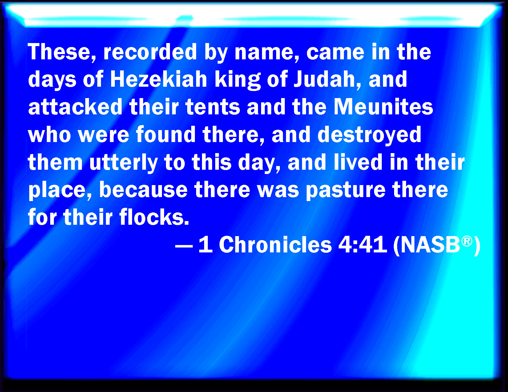 Bible Verse Slide 1 Chronicles 4:41 And these written by name came in the days of Hezekiah king of Judah, and smote their tents, and the habitations that were found there, and destroyed them utterly to this day, and dwelled in their rooms: because there was pasture there for their flocks. KJV: And these written by name came in the days of Hezekiah king of Judah, and smote their tents, and the habitations that were found there, and destroyed them utterly unto this day, and dwelt in their rooms: because there was pasture there for their flocks. DRB: And these whose names are written above, came in the days of Ezechias king of Juda: and they beat down their tents, and slew the inhabitants that were found there, and utterly destroyed them unto this day: and they dwelt in their place, because they found there fat pastures. DBT: And these written by name came in the days of Hezekiah king of Judah, and smote their tents and the habitations that were found there, and destroyed them utterly unto this day, and dwelt in their stead; for there was pasture there for their flocks. ERV: And these written by name came in the days of Hezekiah king of Judah, and smote their tents, and the Meunim that were found there, and destroyed them utterly, unto this day, and dwelt in their stead: because there was pasture there for their flocks. WBT: And these written by name came in the days of Hezekiah king of Judah, and smote their tents, and the habitations that were found there, and destroyed them utterly to this day, and dwelt in their room: because there was pasture there for their flocks. WEB: These written by name came in the days of Hezekiah king of Judah, and struck their tents, and the Meunim who were found there, and destroyed them utterly to this day, and lived in their place; because there was pasture there for their flocks. YLT: And these who are written by name come in the days of Hezekiah king of Judah, and smite their tents, and the habitations that have been found there, and devote them to destruction unto this day, and dwell in their stead, because pasture for their flock is there.Links 1 Chronicles 4:41 NIV • 1 Chronicles 4:41 NLT • 1 Chronicles 4:41 ESV • 1 Chronicles 4:41 NASB • 1 Chronicles 4:41 KJV • 1 Chronicles 4:41 Interlinear • 1 Chronicles 4:41 Commentaries • 1 Chronicles 4:41 Parallel Texts • 1 Chronicles 4:41 Bible Apps • 1 Chronicles 4:41 Parallel • Bible Hub |