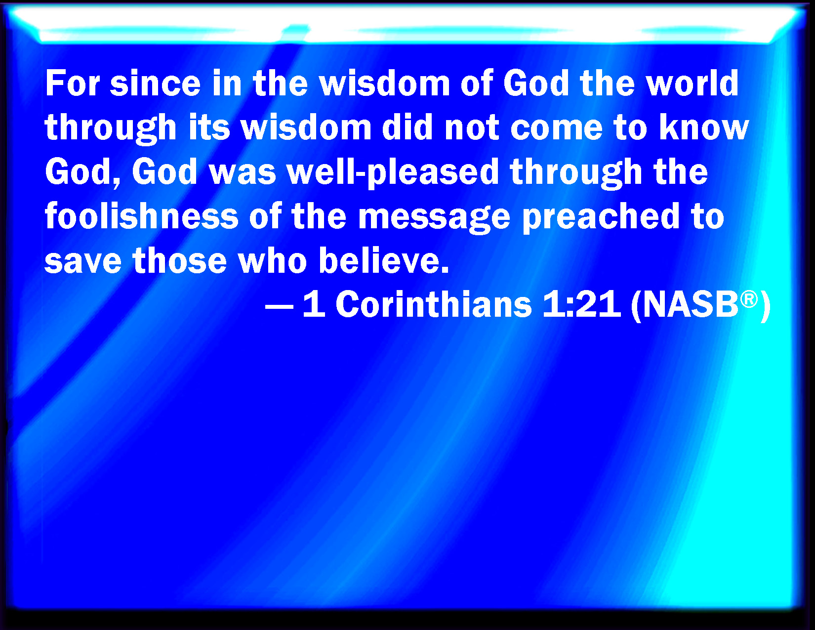 Bible Verse Slide 1 Corinthians 1:21 For after that in the wisdom of God the world by wisdom knew not God, it pleased God by the foolishness of preaching to save them that believe. KJV: For after that in the wisdom of God the world by wisdom knew not God, it pleased God by the foolishness of preaching to save them that believe. DRB: For seeing that in the wisdom of God the world, by wisdom, knew not God, it pleased God, by the foolishness of our preaching, to save them that believe. DBT: For since, in the wisdom of God, the world by wisdom has not known God, God has been pleased by the foolishness of the preaching to save those that believe. ERV: For seeing that in the wisdom of God the world through its wisdom knew not God, it was God's good pleasure through the foolishness of the preaching to save them that believe. WBT: For when in the wisdom of God the world by wisdom knew not God, it pleased God by the foolishness of preaching to save them that believe. WEB: For seeing that in the wisdom of God, the world through its wisdom didn't know God, it was God's good pleasure through the foolishness of the preaching to save those who believe. YLT: for, seeing in the wisdom of God the world through the wisdom knew not God, it did please God through the foolishness of the preaching to save those believing.Links 1 Corinthians 1:21 NIV • 1 Corinthians 1:21 NLT • 1 Corinthians 1:21 ESV • 1 Corinthians 1:21 NASB • 1 Corinthians 1:21 KJV • 1 Corinthians 1:21 Interlinear • 1 Corinthians 1:21 Commentaries • 1 Corinthians 1:21 Parallel Texts • 1 Corinthians 1:21 Bible Apps • 1 Corinthians 1:21 Parallel • Bible Hub |