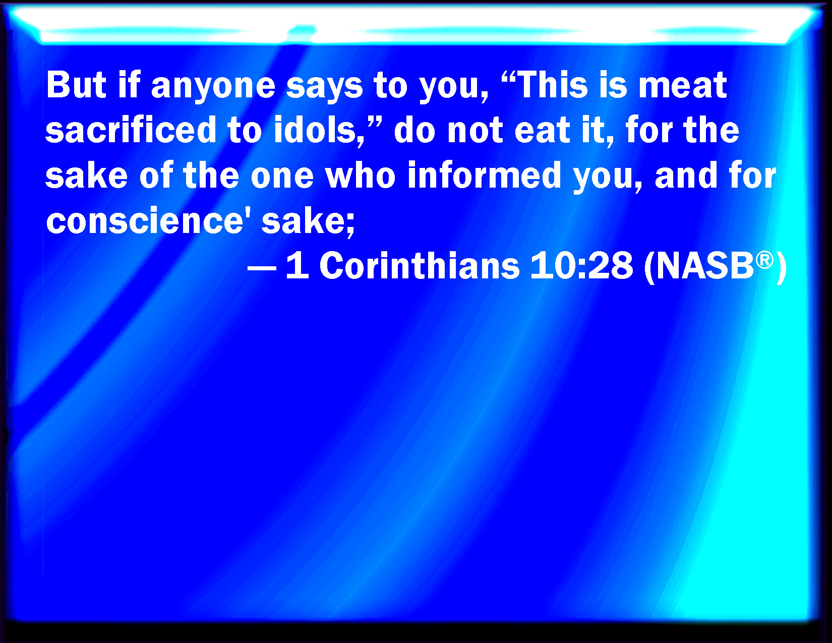 Bible Verse Slide 1 Corinthians 10:28 But if any man say to you, This is offered in sacrifice to idols, eat not for his sake that showed it, and for conscience sake: for the earth is the Lord's, and the fullness thereof: KJV: But if any man say unto you, This is offered in sacrifice unto idols, eat not for his sake that shewed it, and for conscience sake: for the earth is the Lord's, and the fulness thereof: DRB: But if any man say: This has been sacrificed to idols, do not eat of it for his sake that told it, and for conscience' sake. DBT: But if any one say to you, This is offered to holy purposes, do not eat, for his sake that pointed it out, and conscience sake; ERV: But if any man say unto you, This hath been offered in sacrifice, eat not, for his sake that shewed it, and for conscience sake: WBT: But if any man shall say to you, This is offered in sacrifice to idols, eat not for his sake that showed it, and for conscience' sake: for the earth is the Lord's, and its fullness: WEB: But if anyone says to you, "This was offered to idols," don't eat it for the sake of the one who told you, and for the sake of conscience. For "the earth is the Lord's, and all its fullness." YLT: and if any one may say to you, 'This is a thing sacrificed to an idol,' — do not eat, because of that one who shewed it, and of the conscience, for the Lord's is the earth and its fulness:Links 1 Corinthians 10:28 NIV • 1 Corinthians 10:28 NLT • 1 Corinthians 10:28 ESV • 1 Corinthians 10:28 NASB • 1 Corinthians 10:28 KJV • 1 Corinthians 10:28 Interlinear • 1 Corinthians 10:28 Commentaries • 1 Corinthians 10:28 Parallel Texts • 1 Corinthians 10:28 Bible Apps • 1 Corinthians 10:28 Parallel • Bible Hub |