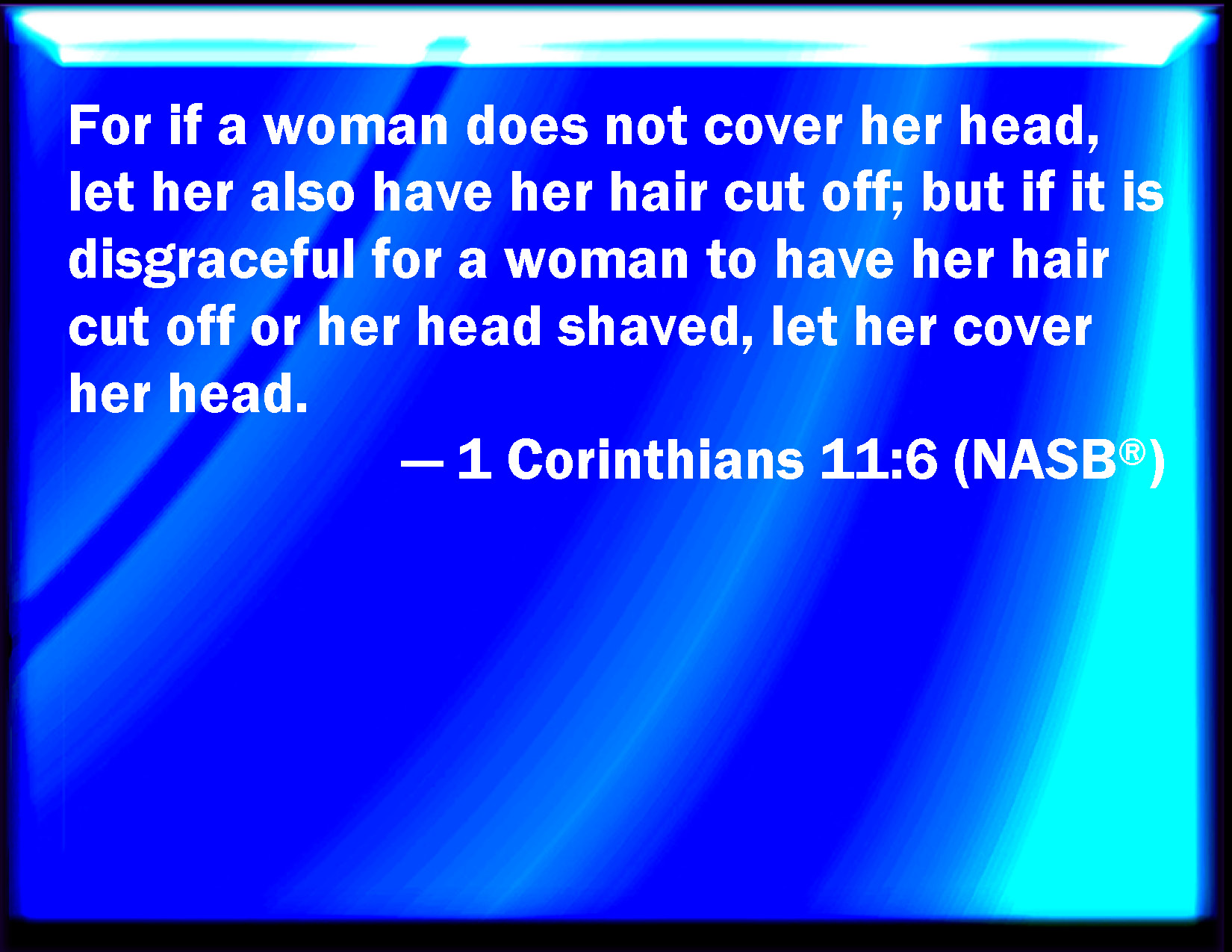 Bible Verse Slide 1 Corinthians 11:6 For if the woman be not covered, let her also be shorn: but if it be a shame for a woman to be shorn or shaven, let her be covered. KJV: For if the woman be not covered, let her also be shorn: but if it be a shame for a woman to be shorn or shaven, let her be covered. DRB: For if a woman be not covered, let her be shorn. But if it be a shame to a woman to be shorn or made bald, let her cover her head. DBT: For if a woman be not covered, let her hair also be cut off. But if it be shameful to a woman to have her hair cut off or to be shaved, let her be covered. ERV: For if a woman is not veiled, let her also be shorn: but if it is a shame to a woman to be shorn or shaven, let her be veiled. WBT: For if the woman is not covered, let her also be shorn: but if it is a shame for a woman to be shorn or shaved, let her be covered. WEB: For if a woman is not covered, let her also be shorn. But if it is shameful for a woman to be shorn or shaved, let her be covered. YLT: for if a woman is not covered — then let her be shorn, and if it is a shame for a woman to be shorn or shaven — let her be covered;Links 1 Corinthians 11:6 NIV • 1 Corinthians 11:6 NLT • 1 Corinthians 11:6 ESV • 1 Corinthians 11:6 NASB • 1 Corinthians 11:6 KJV • 1 Corinthians 11:6 Interlinear • 1 Corinthians 11:6 Commentaries • 1 Corinthians 11:6 Parallel Texts • 1 Corinthians 11:6 Bible Apps • 1 Corinthians 11:6 Parallel • Bible Hub |