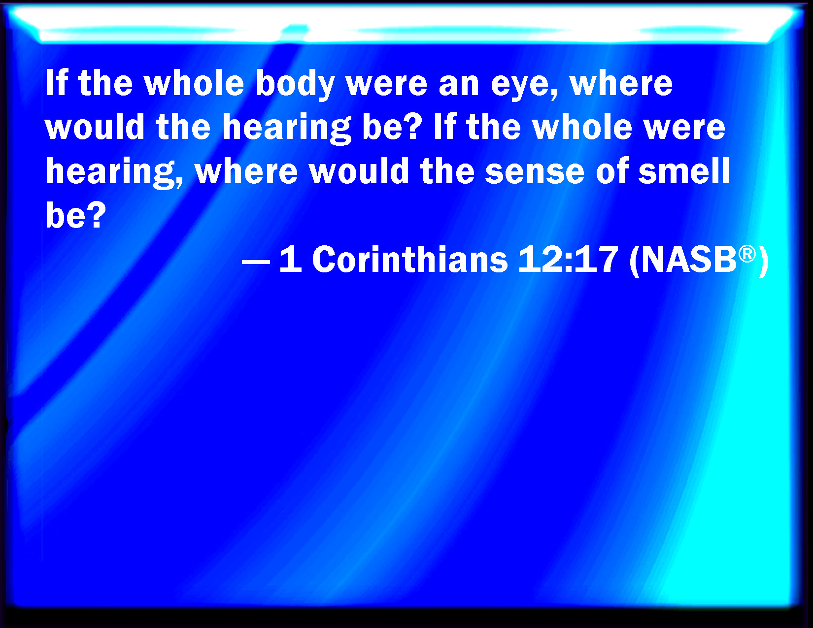 Bible Verse Slide 1 Corinthians 12:17 If the whole body were an eye, where were the hearing? If the whole were hearing, where were the smelling? KJV: If the whole body were an eye, where were the hearing? If the whole were hearing, where were the smelling? DRB: If the whole body were the eye, where would be the hearing? If the whole were hearing, where would be the smelling? DBT: If the whole body were an eye, where the hearing? if all hearing, where the smelling? ERV: If the whole body were an eye, where were the hearing? If the whole were hearing, where were the smelling? WBT: If the whole body were an eye, where were the hearing? If the whole were hearing, where were the smelling? WEB: If the whole body were an eye, where would the hearing be? If the whole were hearing, where would the smelling be? YLT: If the whole body were an eye, where the hearing? if the whole hearing, where the smelling?Links 1 Corinthians 12:17 NIV • 1 Corinthians 12:17 NLT • 1 Corinthians 12:17 ESV • 1 Corinthians 12:17 NASB • 1 Corinthians 12:17 KJV • 1 Corinthians 12:17 Interlinear • 1 Corinthians 12:17 Commentaries • 1 Corinthians 12:17 Parallel Texts • 1 Corinthians 12:17 Bible Apps • 1 Corinthians 12:17 Parallel • Bible Hub |