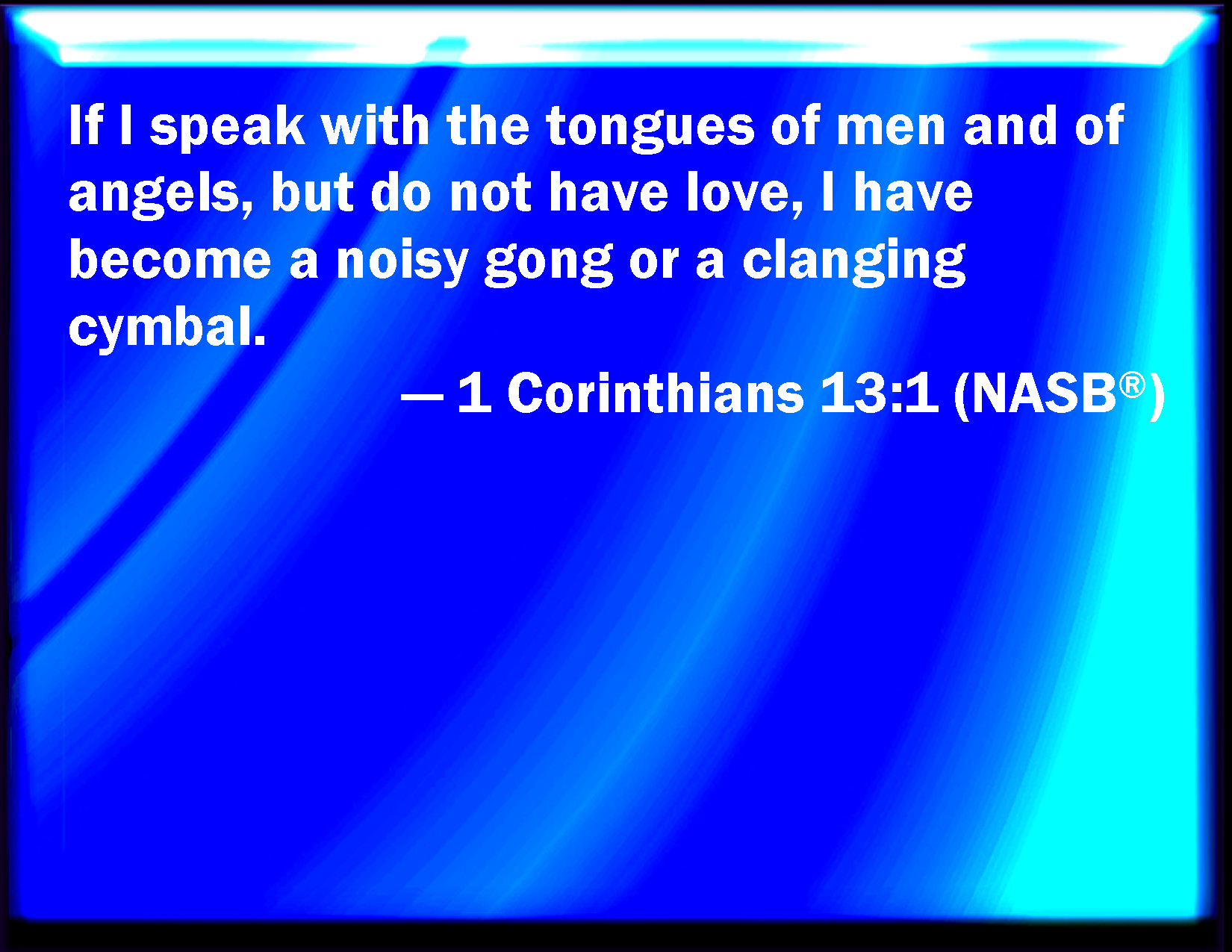 Bible Verse Slide 1 Corinthians 13:1 Though I speak with the tongues of men and of angels, and have not charity, I am become as sounding brass, or a tinkling cymbal. KJV: Though I speak with the tongues of men and of angels, and have not charity, I am become as sounding brass, or a tinkling cymbal. DRB: IF I speak with the tongues of men, and of angels, and have not charity, I am become as sounding brass, or a tinkling cymbal. DBT: If I speak with the tongues of men and of angels, but have not love, I am become sounding brass or a clanging cymbal. ERV: If I speak with the tongues of men and of angels, but have not love, I am become sounding brass, or a clanging cymbal. WBT: Though I speak with the tongues of men and of angels, and have not charity, I am become as sounding brass, or a tinkling cymbal. WEB: If I speak with the languages of men and of angels, but don't have love, I have become sounding brass, or a clanging cymbal. YLT: If with the tongues of men and of messengers I speak, and have not love, I have become brass sounding, or a cymbal tinkling;Links 1 Corinthians 13:1 NIV • 1 Corinthians 13:1 NLT • 1 Corinthians 13:1 ESV • 1 Corinthians 13:1 NASB • 1 Corinthians 13:1 KJV • 1 Corinthians 13:1 Interlinear • 1 Corinthians 13:1 Commentaries • 1 Corinthians 13:1 Parallel Texts • 1 Corinthians 13:1 Bible Apps • 1 Corinthians 13:1 Parallel • Bible Hub |