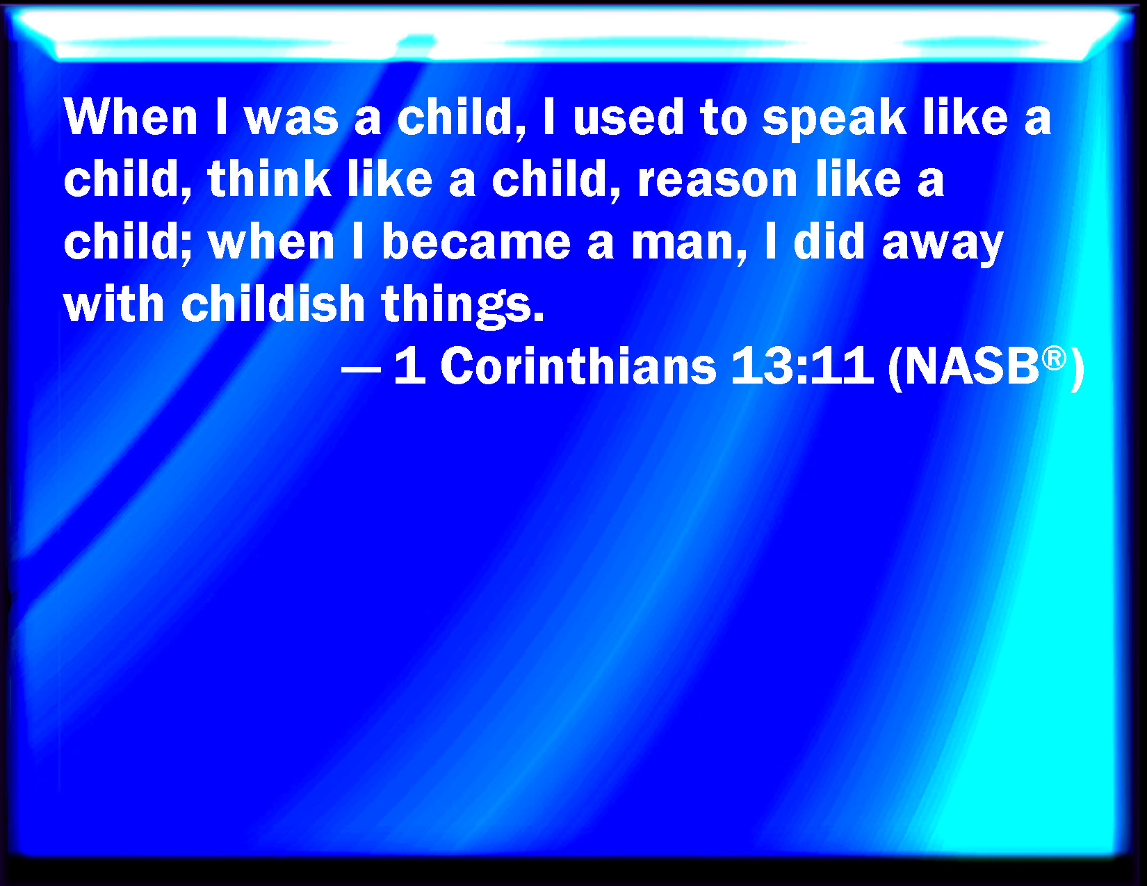 Bible Verse Slide 1 Corinthians 13:11 When I was a child, I spoke as a child, I understood as a child, I thought as a child: but when I became a man, I put away childish things. KJV: When I was a child, I spake as a child, I understood as a child, I thought as a child: but when I became a man, I put away childish things. DRB: When I was a child, I spoke as a child, I understood as a child, I thought as a child. But, when I became a man, I put away the things of a child. DBT: When I was a child, I spoke as a child, I felt as a child, I reasoned as a child; when I became a man, I had done with what belonged to the child. ERV: When I was a child, I spake as a child, I felt as a child, I thought as a child: now that I am become a man, I have put away childish things. WBT: When I was a child, I spoke as a child, I understood as a child, I thought as a child: but when I became a man, I put away childish things. WEB: When I was a child, I spoke as a child, I felt as a child, I thought as a child. Now that I have become a man, I have put away childish things. YLT: When I was a babe, as a babe I was speaking, as a babe I was thinking, as a babe I was reasoning, and when I have become a man, I have made useless the things of the babe;Links 1 Corinthians 13:11 NIV • 1 Corinthians 13:11 NLT • 1 Corinthians 13:11 ESV • 1 Corinthians 13:11 NASB • 1 Corinthians 13:11 KJV • 1 Corinthians 13:11 Interlinear • 1 Corinthians 13:11 Commentaries • 1 Corinthians 13:11 Parallel Texts • 1 Corinthians 13:11 Bible Apps • 1 Corinthians 13:11 Parallel • Bible Hub |
