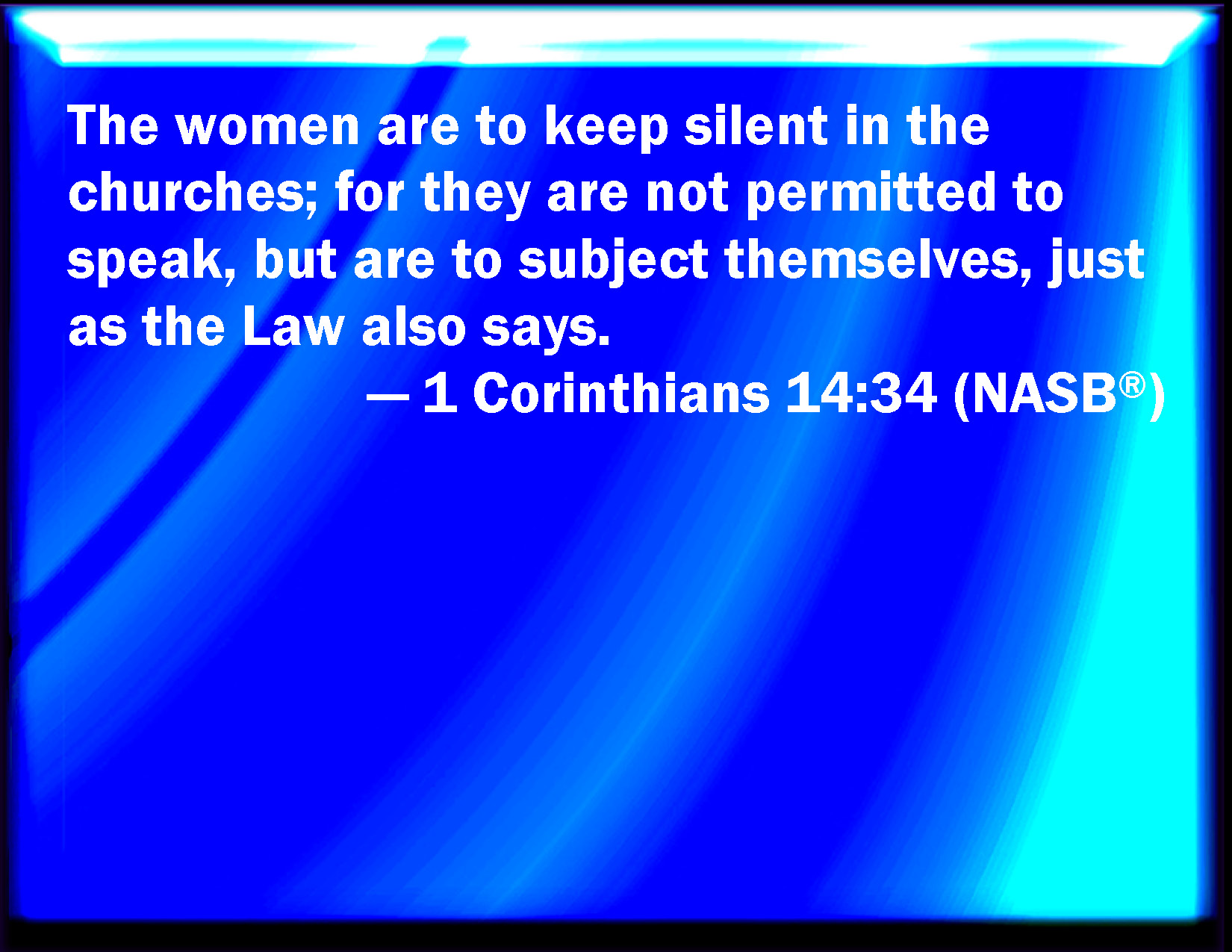 Bible Verse Slide 1 Corinthians 14:34 Let your women keep silence in the churches: for it is not permitted to them to speak; but they are commanded to be under obedience as also said the law. KJV: Let your women keep silence in the churches: for it is not permitted unto them to speak; but they are commanded to be under obedience, as also saith the law. DRB: Let women keep silence in the churches: for it is not permitted them to speak, but to be subject, as also the law saith. DBT: Let your women be silent in the assemblies, for it is not permitted to them to speak; but to be in subjection, as the law also says. ERV: Let the women keep silence in the churches: for it is not permitted unto them to speak; but let them be in subjection, as also saith the law. WBT: Let your women keep silence in the churches; for it is not permitted to them to speak: but they are commanded to be under obedience, as also saith the law. WEB: let your wives keep silent in the assemblies, for it has not been permitted for them to speak; but let them be in subjection, as the law also says. YLT: Your women in the assemblies let them be silent, for it hath not been permitted to them to speak, but to be subject, as also the law saith;Links 1 Corinthians 14:34 NIV • 1 Corinthians 14:34 NLT • 1 Corinthians 14:34 ESV • 1 Corinthians 14:34 NASB • 1 Corinthians 14:34 KJV • 1 Corinthians 14:34 Interlinear • 1 Corinthians 14:34 Commentaries • 1 Corinthians 14:34 Parallel Texts • 1 Corinthians 14:34 Bible Apps • 1 Corinthians 14:34 Parallel • Bible Hub |