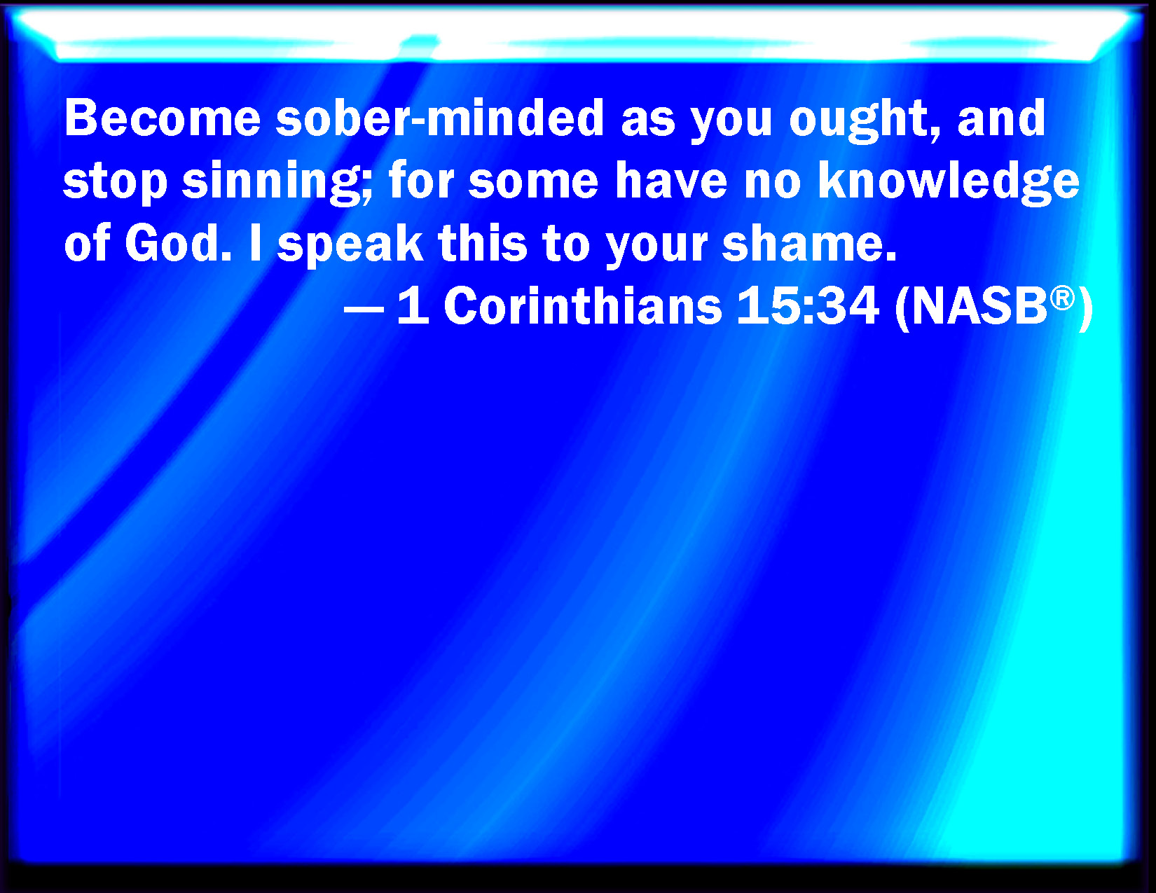 Bible Verse Slide 1 Corinthians 15:34 Awake to righteousness, and sin not; for some have not the knowledge of God: I speak this to your shame. KJV: Awake to righteousness, and sin not; for some have not the knowledge of God: I speak this to your shame. DRB: Awake, ye just, and sin not. For some have not the knowledge of God, I speak it to your shame. DBT: Awake up righteously, and sin not; for some are ignorant of God: I speak to you as a matter of shame. ERV: Awake up righteously, and sin not; for some have no knowledge of God: I speak this to move you to shame. WBT: Awake to righteousness, and sin not; for some have not the knowledge of God. I speak this to your shame. WEB: Wake up righteously, and don't sin, for some have no knowledge of God. I say this to your shame. YLT: awake up, as is right, and sin not; for certain have an ignorance of God; for shame to you I say it.Links 1 Corinthians 15:34 NIV • 1 Corinthians 15:34 NLT • 1 Corinthians 15:34 ESV • 1 Corinthians 15:34 NASB • 1 Corinthians 15:34 KJV • 1 Corinthians 15:34 Interlinear • 1 Corinthians 15:34 Commentaries • 1 Corinthians 15:34 Parallel Texts • 1 Corinthians 15:34 Bible Apps • 1 Corinthians 15:34 Parallel • Bible Hub |