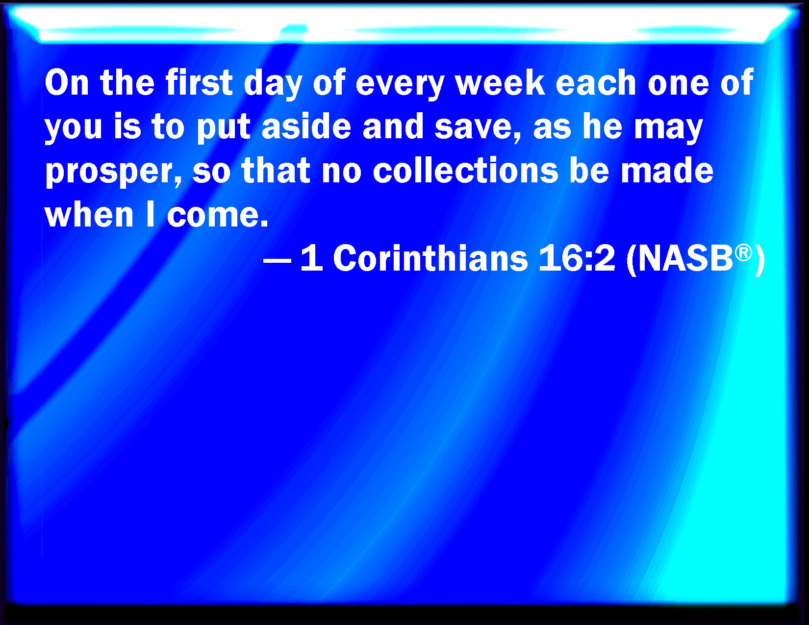 Bible Verse Slide 1 Corinthians 16:2 On the first day of the week let every one of you lay by him in store, as God has prospered him, that there be no gatherings when I come. KJV: Upon the first day of the week let every one of you lay by him in store, as God hath prospered him, that there be no gatherings when I come. DRB: On the first day of the week let every one of you put apart with himself, laying up what it shall well please him; that when I come, the collections be not then to be made. DBT: On the first of the week let each of you put by at home, laying up in whatever degree he may have prospered, that there may be no collections when I come. ERV: Upon the first day of the week let each one of you lay by him in store, as he may prosper, that no collections be made when I come. WBT: Upon the first day of the week, let every one of you lay by him in store, as God hath prospered him, that there be no collections when I come. WEB: On the first day of the week, let each one of you save, as he may prosper, that no collections be made when I come. YLT: on every first day of the week, let each one of you lay by him, treasuring up whatever he may have prospered, that when I may come then collections may not be made;Links 1 Corinthians 16:2 NIV • 1 Corinthians 16:2 NLT • 1 Corinthians 16:2 ESV • 1 Corinthians 16:2 NASB • 1 Corinthians 16:2 KJV • 1 Corinthians 16:2 Interlinear • 1 Corinthians 16:2 Commentaries • 1 Corinthians 16:2 Parallel Texts • 1 Corinthians 16:2 Bible Apps • 1 Corinthians 16:2 Parallel • Bible Hub |