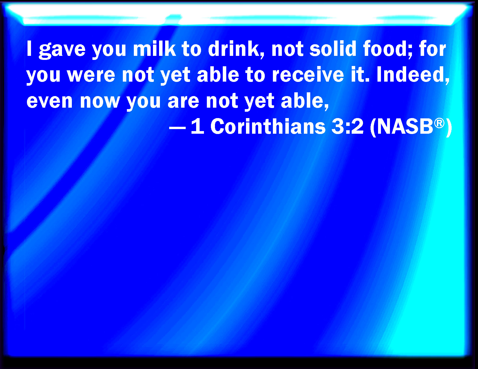 Bible Verse Slide 1 Corinthians 3:2 I have fed you with milk, and not with meat: for till now you were not able to bear it, neither yet now are you able. KJV: I have fed you with milk, and not with meat: for hitherto ye were not able to bear it, neither yet now are ye able. DRB: I gave you milk to drink, not meat; for you were not able as yet. But neither indeed are you now able; for you are yet carnal. DBT: I have given you milk to drink, not meat, for ye have not yet been able, nor indeed are ye yet able; ERV: I fed you with milk, not with meat; for ye were not yet able to bear it: nay, not even now are ye able; WBT: I have fed you with milk, and not with meat: for hitherto ye were not able to bear it, neither yet now are ye able. WEB: I fed you with milk, not with meat; for you weren't yet ready. Indeed, not even now are you ready, YLT: with milk I fed you, and not with meat, for ye were not yet able, but not even yet are ye now able,Links 1 Corinthians 3:2 NIV • 1 Corinthians 3:2 NLT • 1 Corinthians 3:2 ESV • 1 Corinthians 3:2 NASB • 1 Corinthians 3:2 KJV • 1 Corinthians 3:2 Interlinear • 1 Corinthians 3:2 Commentaries • 1 Corinthians 3:2 Parallel Texts • 1 Corinthians 3:2 Bible Apps • 1 Corinthians 3:2 Parallel • Bible Hub |
