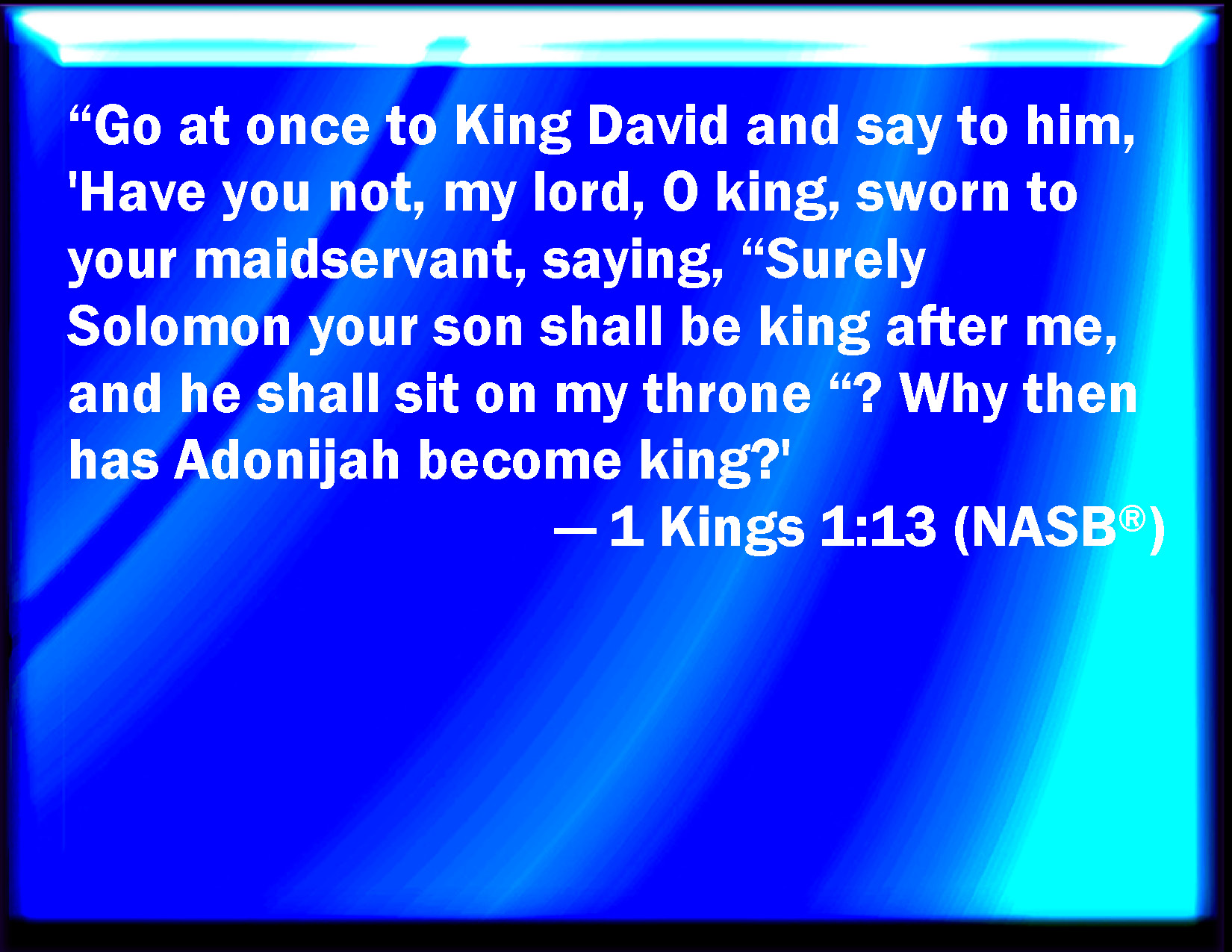 Bible Verse Slide 1 Kings 1:13 Go and get you in to king David, and say to him, Did not you, my lord, O king, swear to your handmaid, saying, Assuredly Solomon your son shall reign after me, and he shall sit on my throne? why then does Adonijah reign? KJV: Go and get thee in unto king David, and say unto him, Didst not thou, my lord, O king, swear unto thine handmaid, saying, Assuredly Solomon thy son shall reign after me, and he shall sit upon my throne? why then doth Adonijah reign? DRB: Go, and get thee in to king David, and say to him: Didst not thou, my lord O king, swear to me thy handmaid, saying: Solomon thy son shall reign after me, and he shall sit on my throne? why then doth Adonias reign? DBT: Go and get thee in to king David, and say to him, Didst not thou, my lord, O king, swear to thy handmaid saying, Solomon thy son shall reign after me, and he shall sit on my throne? why then does Adonijah reign? ERV: Go and get thee in unto king David, and say unto him, Didst not thou, my lord, O king, swear unto thine handmaid, saying, Assuredly Solomon thy son shall reign after me, and he shall sit upon my throne? why then doth Adonijah reign? WBT: Go, and enter in to king David, and say to him, Didst not thou, my lord, O king, swear to thy handmaid, saying, Assuredly Solomon thy son shall reign after me, and he shall sit upon my throne? why then doth Adonijah reign? WEB: Go in to king David, and tell him, 'Didn't you, my lord, king, swear to your handmaid, saying, Assuredly Solomon your son shall reign after me, and he shall sit on my throne? Why then does Adonijah reign?' YLT: go and enter in unto king David, and thou hast said unto him, Hast thou not, my lord, O king, sworn to thy handmaid, saying, Surely Solomon thy son doth reign after me, and he doth sit on my throne? and wherefore hath Adonijah reigned?Links 1 Kings 1:13 NIV • 1 Kings 1:13 NLT • 1 Kings 1:13 ESV • 1 Kings 1:13 NASB • 1 Kings 1:13 KJV • 1 Kings 1:13 Interlinear • 1 Kings 1:13 Commentaries • 1 Kings 1:13 Parallel Texts • 1 Kings 1:13 Bible Apps • 1 Kings 1:13 Parallel • Bible Hub |