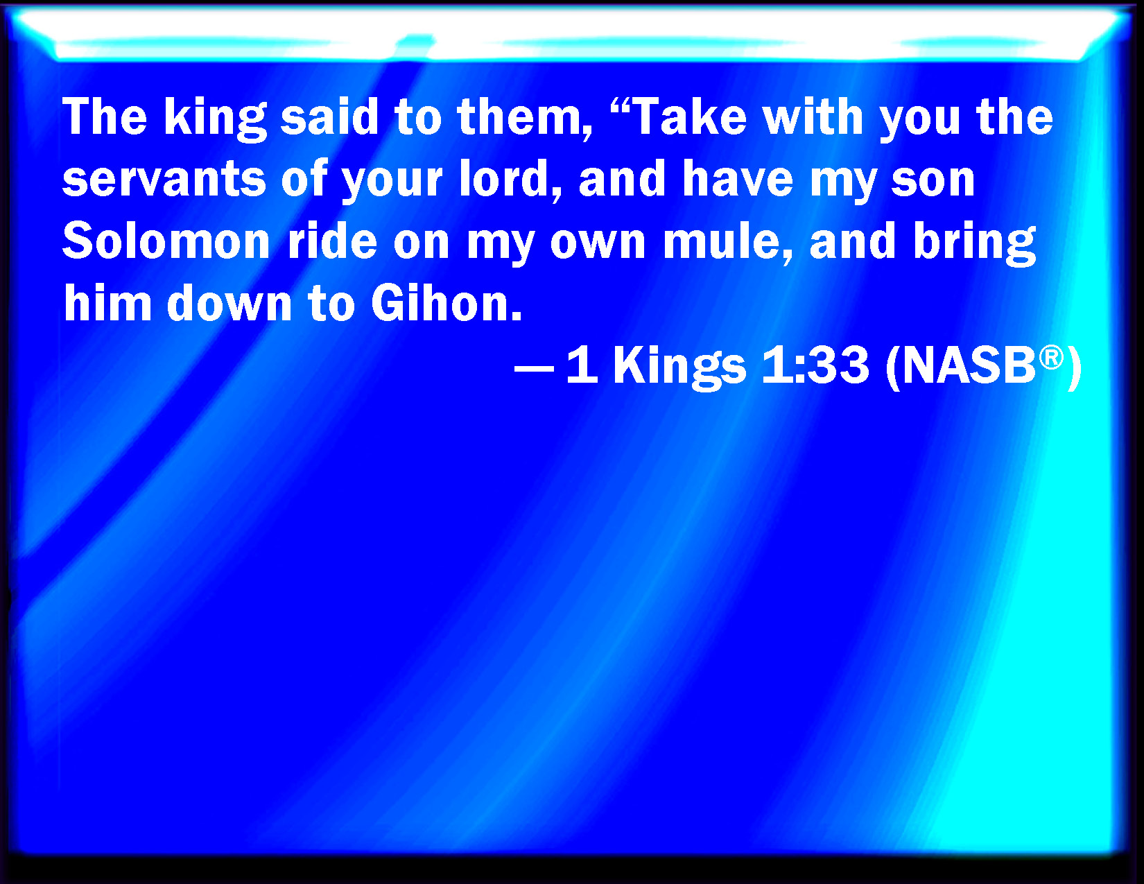 Bible Verse Slide 1 Kings 1:33 The king also said to them, Take with you the servants of your lord, and cause Solomon my son to ride on my own mule, and bring him down to Gihon: KJV: The king also said unto them, Take with you the servants of your lord, and cause Solomon my son to ride upon mine own mule, and bring him down to Gihon: DRB: He said to them: Take with you the servants of your lord, and set my son Solomon upon my mule: and bring him to Gihon. DBT: And the king said to them, Take with you the servants of your lord, and cause Solomon my son to ride upon mine own mule, and bring him down to Gihon; ERV: And the king, said unto them, Take with you the servants of your lord, and cause Solomon my son to ride upon mine own mute, and bring him down to Gihon: WBT: The king also said to them, Take with you the servants of your lord, and cause Solomon my son to ride upon my own mule, and bring him down to Gihon: WEB: The king said to them, "Take with you the servants of your lord, and cause Solomon my son to ride on my own mule, and bring him down to Gihon. YLT: And the king saith to them, 'Take with you the servants of your lord, and ye have caused Solomon my son to ride on mine own mule, and caused him to go down unto Gihon,Links 1 Kings 1:33 NIV • 1 Kings 1:33 NLT • 1 Kings 1:33 ESV • 1 Kings 1:33 NASB • 1 Kings 1:33 KJV • 1 Kings 1:33 Interlinear • 1 Kings 1:33 Commentaries • 1 Kings 1:33 Parallel Texts • 1 Kings 1:33 Bible Apps • 1 Kings 1:33 Parallel • Bible Hub |