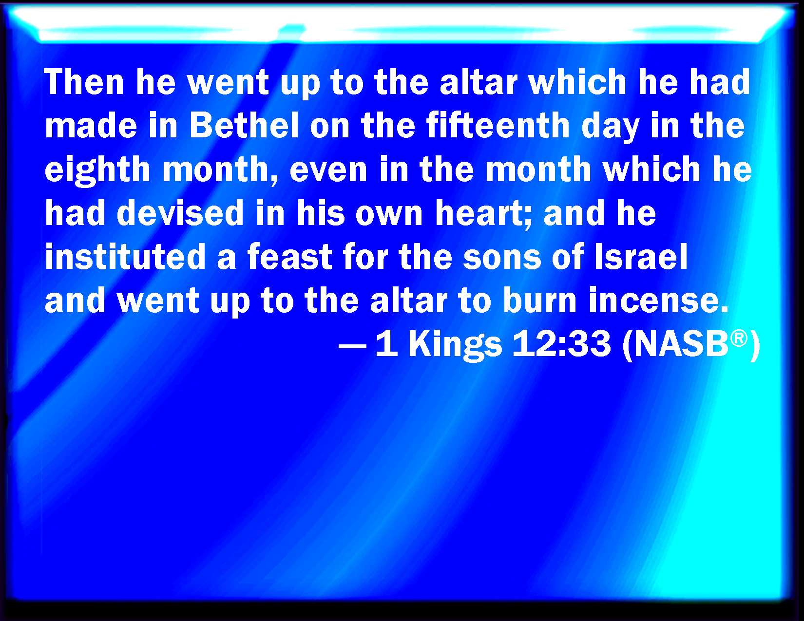 Bible Verse Slide 1 Kings 12:33 So he offered on the altar which he had made in Bethel the fifteenth day of the eighth month, even in the month which he had devised of his own heart; and ordained a feast to the children of Israel: and he offered on the altar, and burnt incense. KJV: So he offered upon the altar which he had made in Bethel the fifteenth day of the eighth month, even in the month which he had devised of his own heart; and ordained a feast unto the children of Israel: and he offered upon the altar, and burnt incense. DRB: And he went up to the altar, which he had built in Bethel, on the fifteenth day of the eighth month, which he had devised of his own heart: and he ordained a feast to the children of Israel, and went upon the altar to burn incense. DBT: And he offered upon the altar that he had made in Bethel, on the fifteenth day of the eighth month, in the month which he had devised of his own heart; and he made a feast for the children of Israel, and he offered upon the altar, burning incense. ERV: And he went up unto the altar which he had made in Beth-el on the fifteenth day in the eighth month, even in the month which he had devised of his own heart: and he ordained a feast for the children of Israel, and went up unto the altar, to burn incense. WBT: So he offered upon the altar which he had made in Beth-el the fifteenth day of the eighth month, even in the month which he had devised of his own heart; and ordained a feast to the children of Israel: and he offered upon the altar, and burnt incense. WEB: He went up to the altar which he had made in Bethel on the fifteenth day in the eighth month, even in the month which he had devised of his own heart: and he ordained a feast for the children of Israel, and went up to the altar, to burn incense. YLT: And he offereth up on the altar that he made in Beth-El, on the fifteenth day of the eighth month, in the month that he devised of his own heart, and he maketh a festival to the sons of Israel, and offereth on the altar — to make perfume.Links 1 Kings 12:33 NIV • 1 Kings 12:33 NLT • 1 Kings 12:33 ESV • 1 Kings 12:33 NASB • 1 Kings 12:33 KJV • 1 Kings 12:33 Interlinear • 1 Kings 12:33 Commentaries • 1 Kings 12:33 Parallel Texts • 1 Kings 12:33 Bible Apps • 1 Kings 12:33 Parallel • Bible Hub |