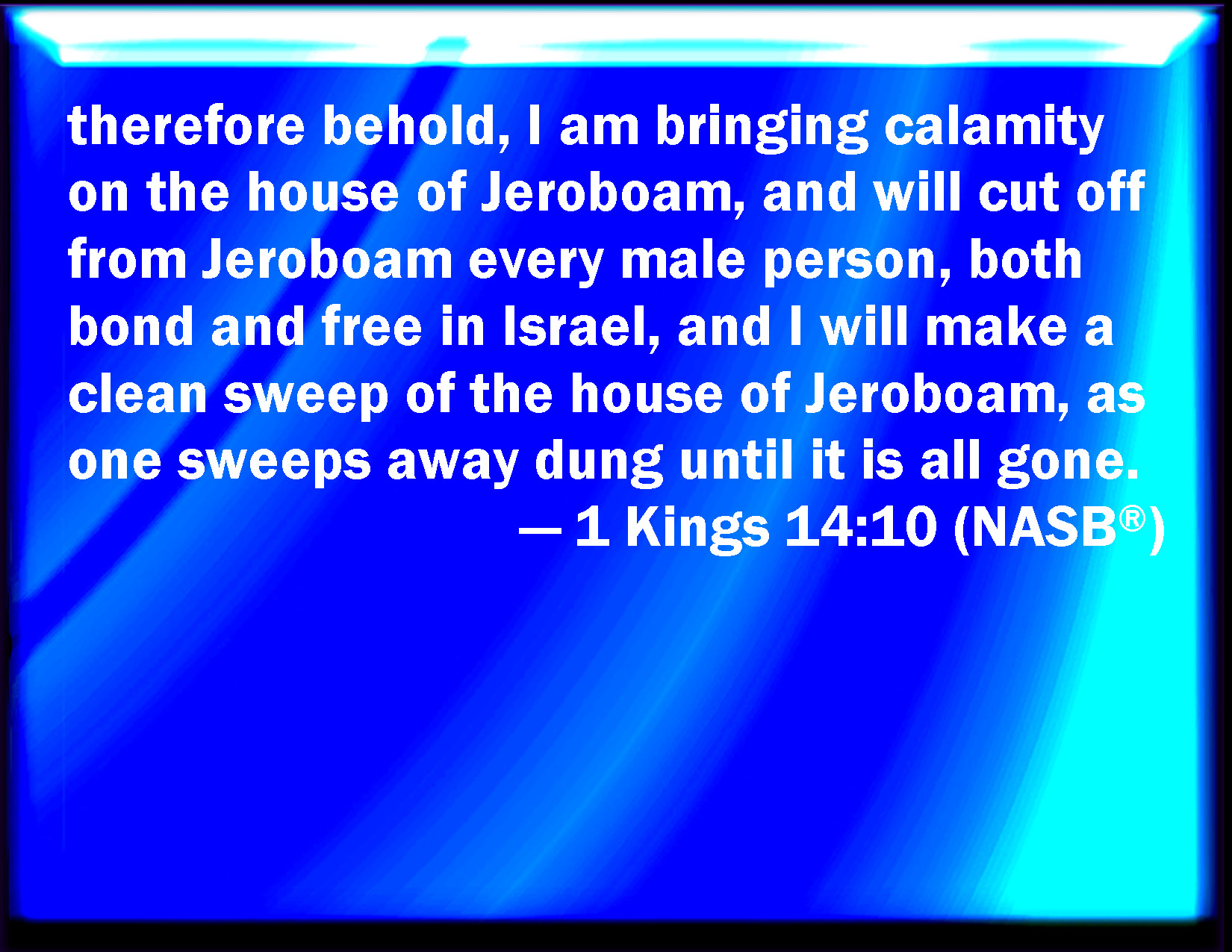 Bible Verse Slide 1 Kings 14:10 Therefore, behold, I will bring evil on the house of Jeroboam, and will cut off from Jeroboam him that urinates against the wall, and him that is shut up and left in Israel, and will take away the remnant of the house of Jeroboam, as a man takes away dung, till it be all gone. KJV: Therefore, behold, I will bring evil upon the house of Jeroboam, and will cut off from Jeroboam him that pisseth against the wall, and him that is shut up and left in Israel, and will take away the remnant of the house of Jeroboam, as a man taketh away dung, till it be all gone. DRB: Therefore behold I will bring evils upon the house of Jeroboam, and will cut off from Jeroboam him that pisseth against the wall, and him that is shut up, and the last in Israel: and I will sweep away the remnant of the house of Jeroboam, as dung is swept away till all be clean. DBT: therefore behold, I will bring evil upon the house of Jeroboam, and will cut off from Jeroboam every male, him that is shut up and left in Israel, and will take away the house of Jeroboam, as a man taketh away dung, till it be all gone. ERV: therefore, behold, I will bring evil upon the house of Jeroboam, and will cut off from Jeroboam every man child, him that is shut up and him that is left at large in Israel, and will utterly sweep away the house of Jeroboam, as a man sweepeth away dung, till it be all gone. WBT: Therefore behold, I will bring evil upon the house of Jeroboam, and will cut off from Jeroboam the males, and him that is shut up and left in Israel, and will take away the remnant of the house of Jeroboam, as a man taketh away dung, till it is all gone. WEB: therefore, behold, I will bring evil on the house of Jeroboam, and will cut off from Jeroboam everyone who urinates on a wall, he who is shut up and he who is left at large in Israel, and will utterly sweep away the house of Jeroboam, as a man sweeps away dung, until it is all gone. YLT: Therefore, lo, I am bringing in evil unto the house of Jeroboam, and have cut off to Jeroboam those sitting on the wall — shut up and left — in Israel, and have put away the posterity of the house of Jeroboam, as one putteth away the dung till its consumption;Links 1 Kings 14:10 NIV • 1 Kings 14:10 NLT • 1 Kings 14:10 ESV • 1 Kings 14:10 NASB • 1 Kings 14:10 KJV • 1 Kings 14:10 Interlinear • 1 Kings 14:10 Commentaries • 1 Kings 14:10 Parallel Texts • 1 Kings 14:10 Bible Apps • 1 Kings 14:10 Parallel • Bible Hub |
