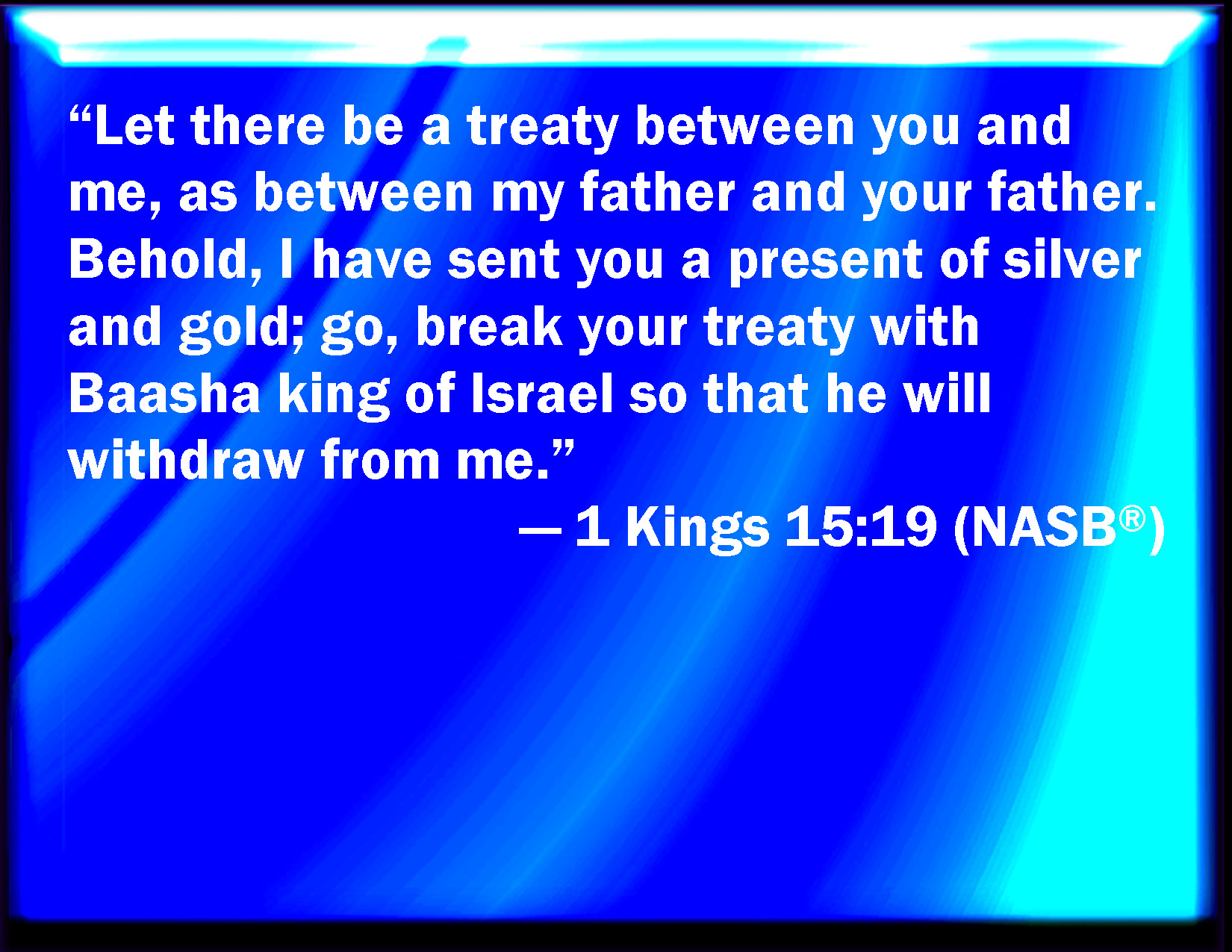 Bible Verse Slide 1 Kings 15:19 There is a league between me and you, and between my father and your father: behold, I have sent to you a present of silver and gold; come and break your league with Baasha king of Israel, that he may depart from me. KJV: There is a league between me and thee, and between my father and thy father: behold, I have sent unto thee a present of silver and gold; come and break thy league with Baasha king of Israel, that he may depart from me. DRB: There is a league between me and thee, and between my father and thy father: therefore I have sent thee presents of silver and gold: and I desire thee to come, and break thy league with Baasa king of Israel, that he may depart from me. DBT: There is a league between me and thee, as between my father and thy father; behold, I send thee a present of silver and gold: go, break thy league with Baasha king of Israel, that he may depart from me. ERV: There is a league between me and thee, between my father and thy father: behold, I have sent unto thee a present of silver and gold; go, break thy league with Baasha king of Israel, that he may depart from me. WBT: There is a league between me and thee, and between my father and thy father: behold, I have sent to thee a present of silver and gold; come and break thy league with Baasha king of Israel, that he may depart from me. WEB: "There is a treaty between me and you, between my father and your father. Behold, I have sent to you a present of silver and gold. Go, break your treaty with Baasha king of Israel, that he may depart from me." YLT: A covenant is between me and thee, between my father and thy father; lo, I have sent to thee a reward of silver and gold; go, break thy covenant with Baasha king of Israel, and he goeth up from off me.'Links 1 Kings 15:19 NIV • 1 Kings 15:19 NLT • 1 Kings 15:19 ESV • 1 Kings 15:19 NASB • 1 Kings 15:19 KJV • 1 Kings 15:19 Interlinear • 1 Kings 15:19 Commentaries • 1 Kings 15:19 Parallel Texts • 1 Kings 15:19 Bible Apps • 1 Kings 15:19 Parallel • Bible Hub |