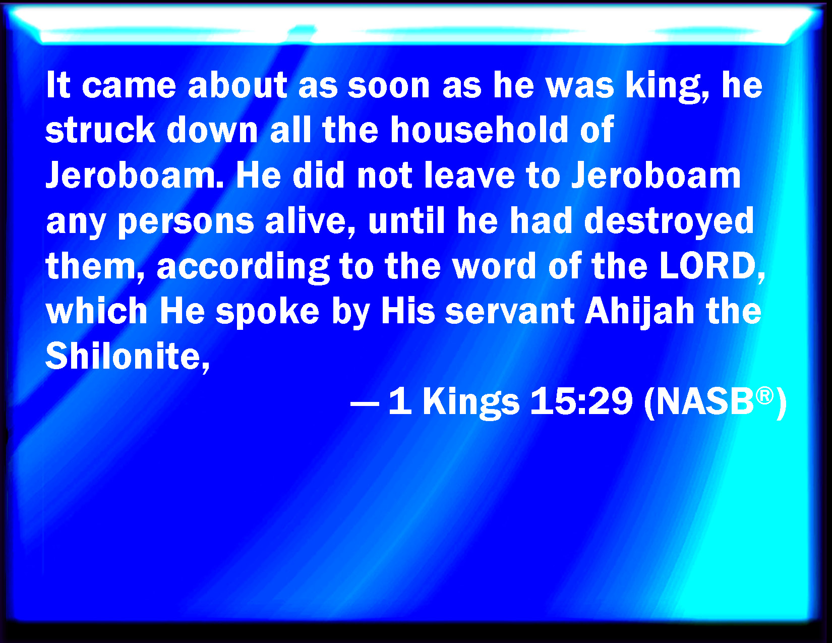 Bible Verse Slide 1 Kings 15:29 And it came to pass, when he reigned, that he smote all the house of Jeroboam; he left not to Jeroboam any that breathed, until he had destroyed him, according to the saying of the LORD, which he spoke by his servant Ahijah the Shilonite: KJV: And it came to pass, when he reigned, that he smote all the house of Jeroboam; he left not to Jeroboam any that breathed, until he had destroyed him, according unto the saying of the LORD, which he spake by his servant Ahijah the Shilonite: DRB: And when he was king he cut off all the house of Jeroboam: he left not so much as one soul of his seed, till he had utterly destroyed him, according to the word of the Lord, which he had spoken in the hand of Ahias the Silonite: DBT: And it came to pass when he was king, he smote all the house of Jeroboam; he left to Jeroboam none that breathed; until he had destroyed him, according to the word of Jehovah which he spoke by his servant Ahijah the Shilonite, ERV: And it came to pass that, as soon as he was king, he smote all the house of Jeroboam; he left not to Jeroboam any that breathed, until he had destroyed him; according unto the saying of the LORD, which he spake by the hand of his servant Ahijah the Shilonite: WBT: And it came to pass, when he reigned, that he smote all the house of Jeroboam; he left not to Jeroboam any that breathed, until he had destroyed him, according to the saying of the LORD, which he spoke by his servant Ahijah the Shilonite: WEB: It happened that, as soon as he was king, he struck all the house of Jeroboam: he didn't leave to Jeroboam any who breathed, until he had destroyed him; according to the saying of Yahweh, which he spoke by his servant Ahijah the Shilonite; YLT: And it cometh to pass, at his reigning, he hath smitten the whole house of Jeroboam, he hath not left any breathing to Jeroboam till his destroying him, according to the word of Jehovah, that He spake by the hand of His servant Ahijah the Shilonite,Links 1 Kings 15:29 NIV • 1 Kings 15:29 NLT • 1 Kings 15:29 ESV • 1 Kings 15:29 NASB • 1 Kings 15:29 KJV • 1 Kings 15:29 Interlinear • 1 Kings 15:29 Commentaries • 1 Kings 15:29 Parallel Texts • 1 Kings 15:29 Bible Apps • 1 Kings 15:29 Parallel • Bible Hub |