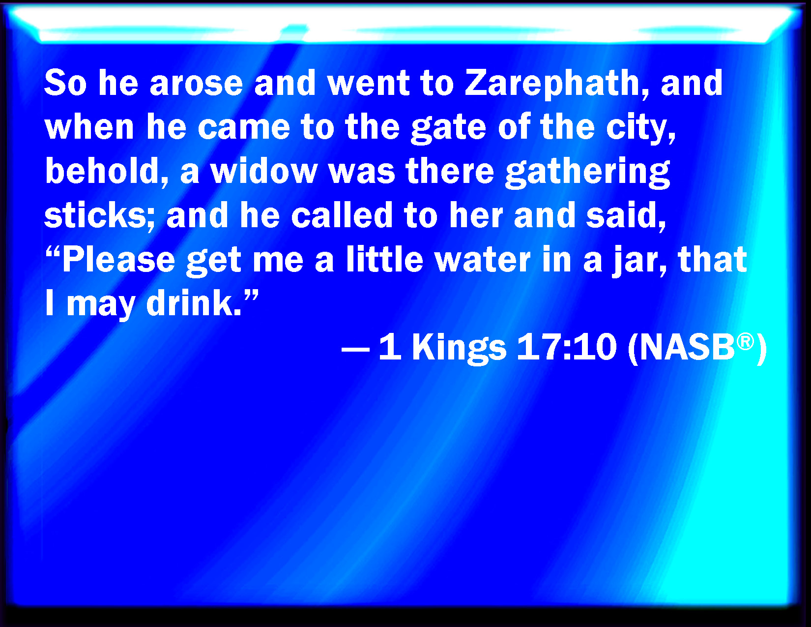 Bible Verse Slide 1 Kings 17:10 So he arose and went to Zarephath. And when he came to the gate of the city, behold, the widow woman was there gathering of sticks: and he called to her, and said, Fetch me, I pray you, a little water in a vessel, that I may drink. KJV: So he arose and went to Zarephath. And when he came to the gate of the city, behold, the widow woman was there gathering of sticks: and he called to her, and said, Fetch me, I pray thee, a little water in a vessel, that I may drink. DRB: He arose, and went to Sarephta. And when he was come to the gate of the city, he saw the widow woman gathering sticks, and he called her, and said to her: Give me a little water in a vessel, that I may drink. DBT: And he arose and went to Zarephath; and when he came to the entrance of the city, behold, a widow woman was there gathering sticks. And he called to her and said, Fetch me, I pray thee, a little water in a vessel, that I may drink. ERV: So he arose and went to Zarephath; and when he came to the gate of the city, behold, a widow woman was there gathering sticks: and he called to her, and said, Fetch me, I pray thee, a little water in a vessel, that I may drink. WBT: So he arose and went to Zarephath. And when he came to the gate of the city, behold, the widow woman was there gathering sticks: and he called to her, and said, Bring me, I pray thee, a little water in a vessel, that I may drink. WEB: So he arose and went to Zarephath; and when he came to the gate of the city, behold, a widow was there gathering sticks: and he called to her, and said, "Please get me a little water in a vessel, that I may drink." YLT: And he riseth, and goeth to Zarephath, and cometh in unto the opening of the city, and lo there, a widow woman gathering sticks, and he calleth unto her, and saith, 'Bring, I pray thee, to me, a little water in a vessel, and I drink.'Links 1 Kings 17:10 NIV • 1 Kings 17:10 NLT • 1 Kings 17:10 ESV • 1 Kings 17:10 NASB • 1 Kings 17:10 KJV • 1 Kings 17:10 Interlinear • 1 Kings 17:10 Commentaries • 1 Kings 17:10 Parallel Texts • 1 Kings 17:10 Bible Apps • 1 Kings 17:10 Parallel • Bible Hub |