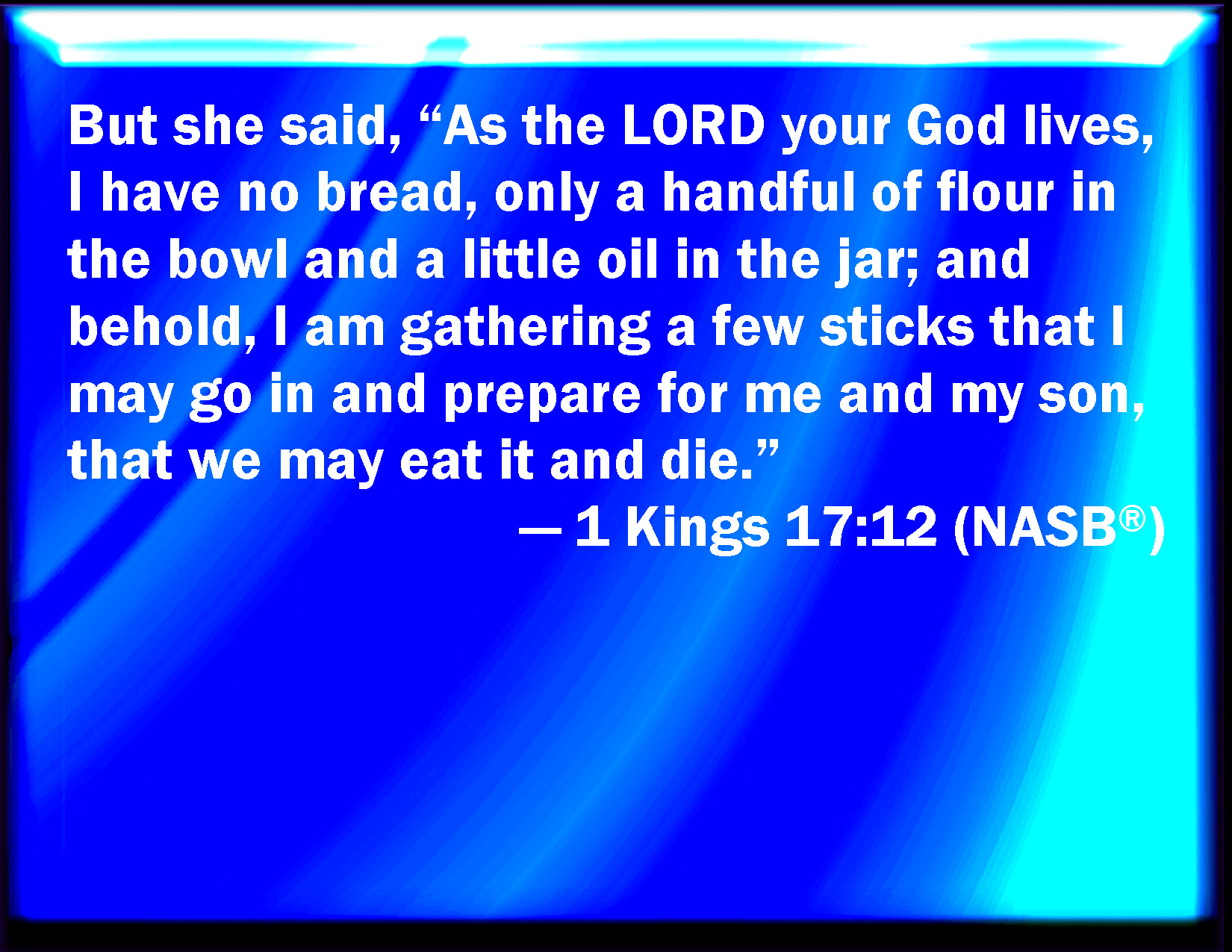 Bible Verse Slide 1 Kings 17:12 And she said, As the LORD your God lives, I have not a cake, but an handful of meal in a barrel, and a little oil in a cruse: and, behold, I am gathering two sticks, that I may go in and dress it for me and my son, that we may eat it, and die. KJV: And she said, As the LORD thy God liveth, I have not a cake, but an handful of meal in a barrel, and a little oil in a cruse: and, behold, I am gathering two sticks, that I may go in and dress it for me and my son, that we may eat it, and die. DRB: And she answered: As the Lord thy God liveth, I have no bread, but only a handful of meal in a pot, and a little oil in a cruse: behold I am gathering two sticks that I may go in and dress it, for me and my son, that we may eat it, and die. DBT: And she said, As Jehovah thy God liveth, I have not a cake, but a handful of meal in a barrel, and a little oil in a cruse; and behold, I am gathering two sticks, that I may go in and dress it for me and my son, that we may eat it, and die. ERV: And she said, As the LORD thy God liveth, I have not a cake, but an handful of meal in the barrel, and a little oil in the cruse: and, behold, I am gathering two sticks, that I may go in and dress it for me and my son, that we may eat it, and die. WBT: And she said, As the LORD thy God liveth, I have not a cake, but a handful of meal in a barrel, and a little oil in a cruse: and behold, I am gathering two sticks, that I may go in and dress it for me and my son, that we may eat it, and die. WEB: She said, "As Yahweh your God lives, I don't have a cake, but a handful of meal in the jar, and a little oil in the jar. Behold, I am gathering two sticks, that I may go in and bake it for me and my son, that we may eat it, and die." YLT: And she saith, 'Jehovah thy God liveth, I have not a cake, but the fulness of the hand of meal in a pitcher, and a little oil in a dish; and lo, I am gathering two sticks, and have gone in and prepared it for myself, and for my son, and we have eaten it — and died.'Links 1 Kings 17:12 NIV • 1 Kings 17:12 NLT • 1 Kings 17:12 ESV • 1 Kings 17:12 NASB • 1 Kings 17:12 KJV • 1 Kings 17:12 Interlinear • 1 Kings 17:12 Commentaries • 1 Kings 17:12 Parallel Texts • 1 Kings 17:12 Bible Apps • 1 Kings 17:12 Parallel • Bible Hub |