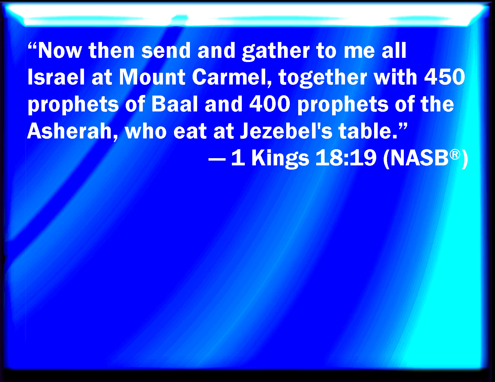 Bible Verse Slide 1 Kings 18:19 Now therefore send, and gather to me all Israel to mount Carmel, and the prophets of Baal four hundred and fifty, and the prophets of the groves four hundred, which eat at Jezebel's table. KJV: Now therefore send, and gather to me all Israel unto mount Carmel, and the prophets of Baal four hundred and fifty, and the prophets of the groves four hundred, which eat at Jezebel's table. DRB: Nevertheless send now, and gather unto me all Israel, unto mount Carmel, and the prophets of Baal four hundred and fifty, and the prophets of the groves four hundred, who eat at Jezabel's table. DBT: And now send, gather to me all Israel to mount Carmel, and the prophets of Baal four hundred and fifty, and the prophets of the Asherah four hundred, who eat at Jezebel's table. ERV: Now therefore send, and gather to me all Israel unto mount Carmel, and the prophets of Baal four hundred and fifty, and the prophets of the Asherah four hundred, which eat at Jezebel's table. WBT: Now therefore send, and gather to me all Israel to mount Carmel, and the prophets of Baal four hundred and fifty, and the prophets of the groves four hundred, who eat at Jezebel's table. WEB: Now therefore send, and gather to me all Israel to Mount Carmel, and four hundred fifty of the prophets of Baal, and four hundred of the prophets of the Asherah, who eat at Jezebel's table." YLT: and now, send, gather unto me all Israel, unto the mount of Carmel, and the prophets of Baal four hundred and fifty, and the prophets of the shrine, four hundred — eating at the table of Jezebel.'Links 1 Kings 18:19 NIV • 1 Kings 18:19 NLT • 1 Kings 18:19 ESV • 1 Kings 18:19 NASB • 1 Kings 18:19 KJV • 1 Kings 18:19 Interlinear • 1 Kings 18:19 Commentaries • 1 Kings 18:19 Parallel Texts • 1 Kings 18:19 Bible Apps • 1 Kings 18:19 Parallel • Bible Hub |