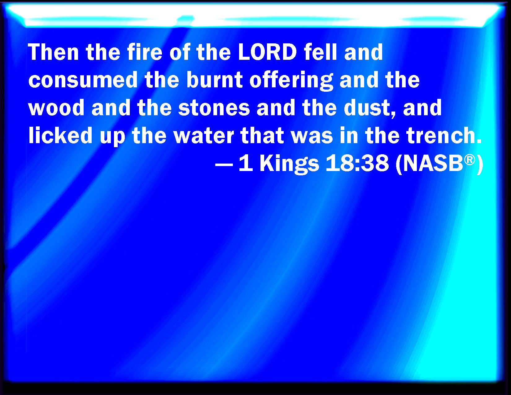 Bible Verse Slide 1 Kings 18:38 Then the fire of the LORD fell, and consumed the burnt sacrifice, and the wood, and the stones, and the dust, and licked up the water that was in the trench. KJV: Then the fire of the LORD fell, and consumed the burnt sacrifice, and the wood, and the stones, and the dust, and licked up the water that was in the trench. DRB: Then the fire of the Lord fell, and consumed the holocaust, and the wood, and the stones, and the dust, and licked up the water that was in the trench. DBT: And the fire of Jehovah fell, and consumed the burnt-offering, and the wood, and the stones, and the dust, and licked up the water that was in the trench. ERV: Then the fire of the LORD fell, and consumed the burnt offering, and the wood, and the stones, and the dust, and licked up the water that was in the trench. WBT: Then the fire of the LORD fell, and consumed the burnt-sacrifice, and the wood, and the stones, and the dust, and licked up the water that was in the trench. WEB: Then the fire of Yahweh fell, and consumed the burnt offering, and the wood, and the stones, and the dust, and licked up the water that was in the trench. YLT: And there falleth a fire of Jehovah, and consumeth the burnt-offering, and the wood, and the stones, and the dust, and the water that is in the trench it hath licked up.Links 1 Kings 18:38 NIV • 1 Kings 18:38 NLT • 1 Kings 18:38 ESV • 1 Kings 18:38 NASB • 1 Kings 18:38 KJV • 1 Kings 18:38 Interlinear • 1 Kings 18:38 Commentaries • 1 Kings 18:38 Parallel Texts • 1 Kings 18:38 Bible Apps • 1 Kings 18:38 Parallel • Bible Hub |