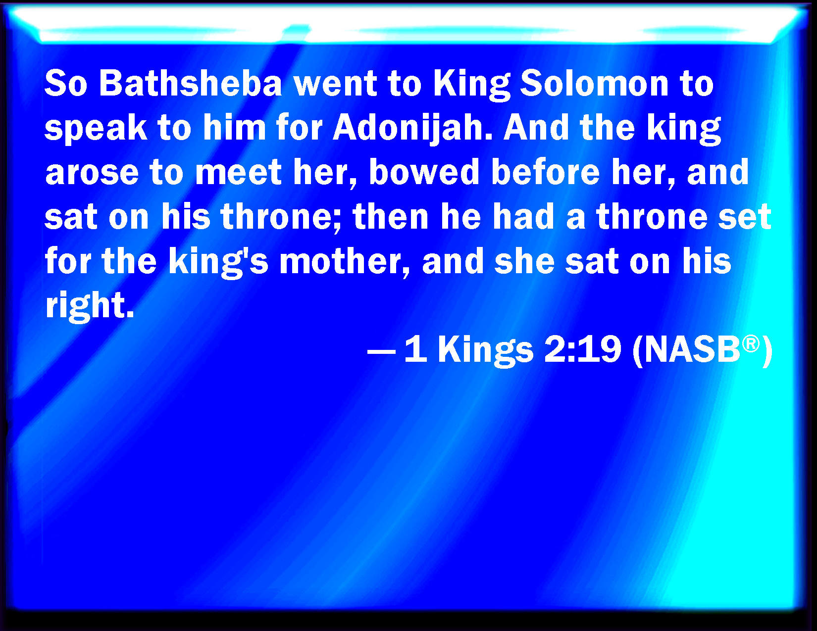 Bible Verse Slide 1 Kings 2:19 Bathsheba therefore went to king Solomon, to speak to him for Adonijah. And the king rose up to meet her, and bowed himself to her, and sat down on his throne, and caused a seat to be set for the king's mother; and she sat on his right hand. KJV: Bathsheba therefore went unto king Solomon, to speak unto him for Adonijah. And the king rose up to meet her, and bowed himself unto her, and sat down on his throne, and caused a seat to be set for the king's mother; and she sat on his right hand. DRB: Then Bethsabee came to king Solomon, to speak to him for Adonias: and the king arose to meet her, and bowed to her, and sat down upon his throne: and a throne was set for the king's mother, and she sat on his right hand. DBT: And Bathsheba went to king Solomon, to speak to him for Adonijah. And the king rose up to meet her, and bowed himself to her, and sat down on his throne; and he caused a throne to be set for the king's mother, and she sat on his right hand. ERV: Bath-sheba therefore went unto king Solomon, to speak unto him for Adonijah. And the king rose up to meet her, and bowed himself unto her, and sat down on his throne, and caused a throne to be set for the king's mother; and she sat on his right hand. WBT: Bath-sheba therefore went to king Solomon, to speak to him for Adonijah. And the king rose up to meet her, and bowed himself to her, and sat down on his throne, and caused a seat to be set for the king's mother; and she sat on his right hand. WEB: Bathsheba therefore went to king Solomon, to speak to him for Adonijah. The king rose up to meet her, and bowed himself to her, and sat down on his throne, and caused a throne to be set for the king's mother; and she sat on his right hand. YLT: And Bath-Sheba cometh in unto king Solomon to speak to him for Adonijah, and the king riseth to meet her, and boweth himself to her, and sitteth on his throne, and placeth a throne for the mother of the king, and she sitteth at his right hand.Links 1 Kings 2:19 NIV • 1 Kings 2:19 NLT • 1 Kings 2:19 ESV • 1 Kings 2:19 NASB • 1 Kings 2:19 KJV • 1 Kings 2:19 Interlinear • 1 Kings 2:19 Commentaries • 1 Kings 2:19 Parallel Texts • 1 Kings 2:19 Bible Apps • 1 Kings 2:19 Parallel • Bible Hub |