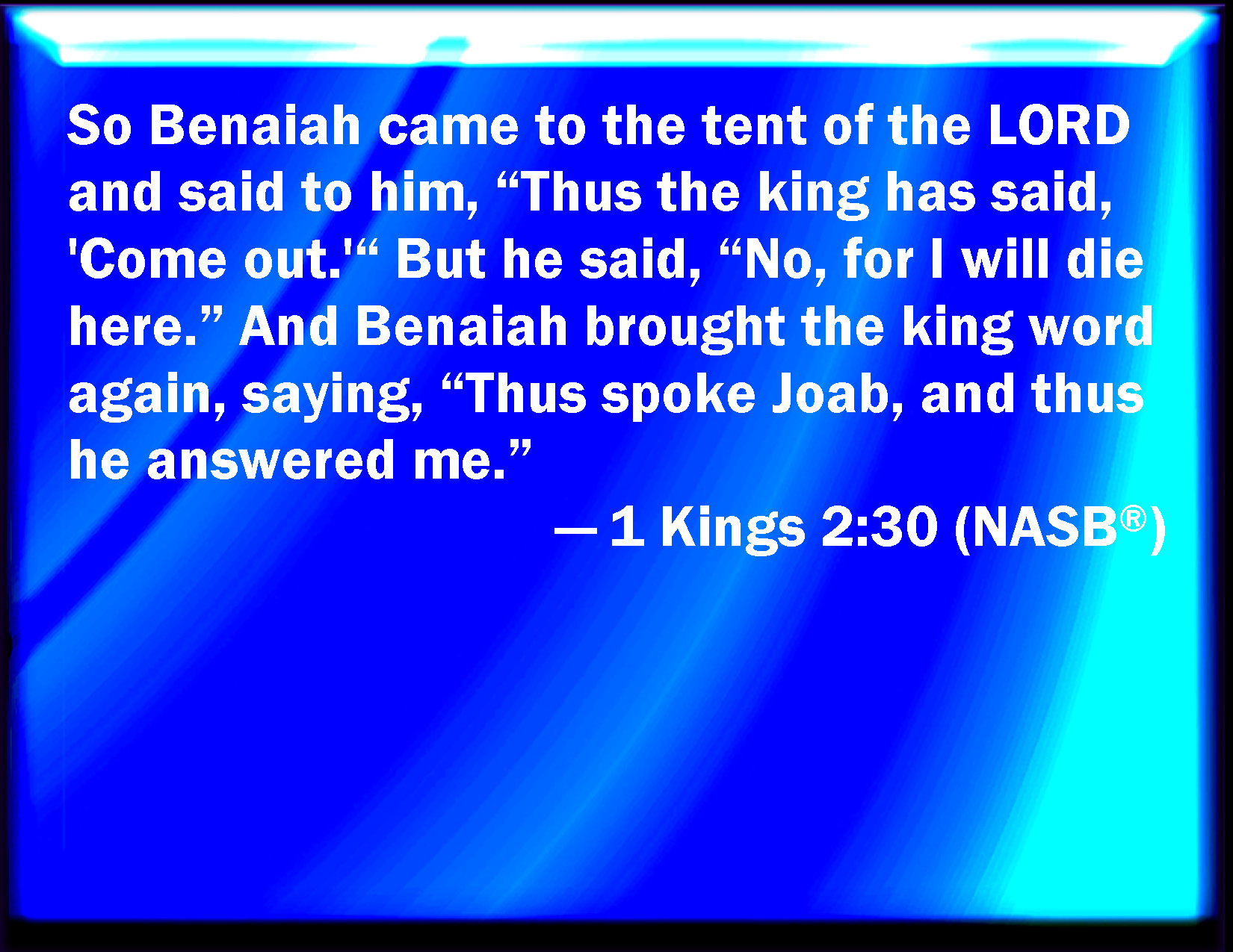 Bible Verse Slide 1 Kings 2:30 And Benaiah came to the tabernacle of the LORD, and said to him, Thus said the king, Come forth. And he said, No; but I will die here. And Benaiah brought the king word again, saying, Thus said Joab, and thus he answered me. KJV: And Benaiah came to the tabernacle of the LORD, and said unto him, Thus saith the king, Come forth. And he said, Nay; but I will die here. And Benaiah brought the king word again, saying, Thus said Joab, and thus he answered me. DRB: And Banaias came to the tabernacle of the Lord, and said to him: Thus saith the king: Come forth. And he said: I will not come forth, but here I will die. Banaias brought word back to the king, saying: Thus saith Joab, and thus he answered me. DBT: And Benaiah came to the tent of Jehovah and said to him, Thus saith the king: Come forth. And he said, No; for I will die here. And Benaiah brought the king word again, saying, Thus said Joab, and thus he answered me. ERV: And Benaiah came to the Tent of the LORD, and said unto him, Thus saith the king, Come forth. And he said, Nay; but I will die here. And Benaiah brought the king word again, saying, Thus said Joab, and thus he answered me. WBT: And Benaiah came to the tabernacle of the LORD, and said to him, Thus saith the king, Come forth. And he said, No; but I will die here. And Benaiah brought the king word again, saying, Thus said Joab, and thus he answered me. WEB: Benaiah came to the Tent of Yahweh, and said to him, "Thus says the king, 'Come forth!'" He said, "No; but I will die here." Benaiah brought the king word again, saying, "Thus said Joab, and thus he answered me." YLT: And Benaiah cometh in unto the tent of Jehovah, and saith unto him, 'Thus said the king, Come out;' and he saith, 'Nay, but here I die.' And Benaiah bringeth back the king word, saying, 'Thus spake Joab, yea, thus he answered me.'Links 1 Kings 2:30 NIV • 1 Kings 2:30 NLT • 1 Kings 2:30 ESV • 1 Kings 2:30 NASB • 1 Kings 2:30 KJV • 1 Kings 2:30 Interlinear • 1 Kings 2:30 Commentaries • 1 Kings 2:30 Parallel Texts • 1 Kings 2:30 Bible Apps • 1 Kings 2:30 Parallel • Bible Hub |