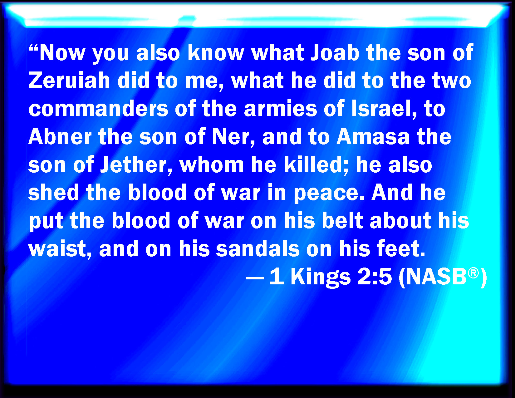 Bible Verse Slide 1 Kings 2:5 Moreover you know also what Joab the son of Zeruiah did to me, and what he did to the two captains of the hosts of Israel, to Abner the son of Ner, and to Amasa the son of Jether, whom he slew, and shed the blood of war in peace, and put the blood of war on his girdle that was about his loins, and in his shoes that were on his feet. KJV: Moreover thou knowest also what Joab the son of Zeruiah did to me, and what he did to the two captains of the hosts of Israel, unto Abner the son of Ner, and unto Amasa the son of Jether, whom he slew, and shed the blood of war in peace, and put the blood of war upon his girdle that was about his loins, and in his shoes that were on his feet. DRB: Thou knowest also what Joab the son of Sarvia hath done to me, what he did to the two captains of the army of Israel, to Abner the son of Ner, and to Amasa the son of Jether: whom he slew, and shed the blood of war in peace, and put the blood of war on his girdle that was about his loins, and in his shoes that were on his feet. DBT: And thou knowest also what Joab the son of Zeruiah did to me, what he did to the two captains of the hosts of Israel, to Abner the son of Ner, and to Amasa the son of Jether, whom he slew, and shed the blood of war in peace, and put the blood of war upon his girdle that was about his loins, and upon his sandals that were on his feet. ERV: Moreover thou knowest also what Joab the son of Zeruiah did unto me, even what he did to the two captains of the hosts of Israel, unto Abner the son of Ner, and unto Amasa the son of Jether, whom he slew, and shed the blood of war in peace, and put the blood of war upon his girdle that was about his loins, and in his shoes that were on his feet. WBT: Moreover, thou knowest also what Joab the son of Zeruiah did to me, and what he did to the two captains of the armies of Israel, to Abner the son of Ner, and to Amasa the son of Jether, whom he slew, and shed the blood of war in peace, and put the blood of war upon his girdle that was about his loins, and in his shoes that were on his feet. WEB: "Moreover you know also what Joab the son of Zeruiah did to me, even what he did to the two captains of the armies of Israel, to Abner the son of Ner, and to Amasa the son of Jether, whom he killed, and shed the blood of war in peace, and put the blood of war on his sash that was about his waist, and in his shoes that were on his feet. YLT: And also, thou hast known that which he did to me — Joab son of Zeruiah — that which he did to two heads of the hosts of Israel, to Abner son of Ner, and to Amasa son of Jether — that he slayeth them, and maketh the blood of war in peace, and putteth the blood of war in his girdle, that is on his loins, and in his sandals that are on his feet;Links 1 Kings 2:5 NIV • 1 Kings 2:5 NLT • 1 Kings 2:5 ESV • 1 Kings 2:5 NASB • 1 Kings 2:5 KJV • 1 Kings 2:5 Interlinear • 1 Kings 2:5 Commentaries • 1 Kings 2:5 Parallel Texts • 1 Kings 2:5 Bible Apps • 1 Kings 2:5 Parallel • Bible Hub |