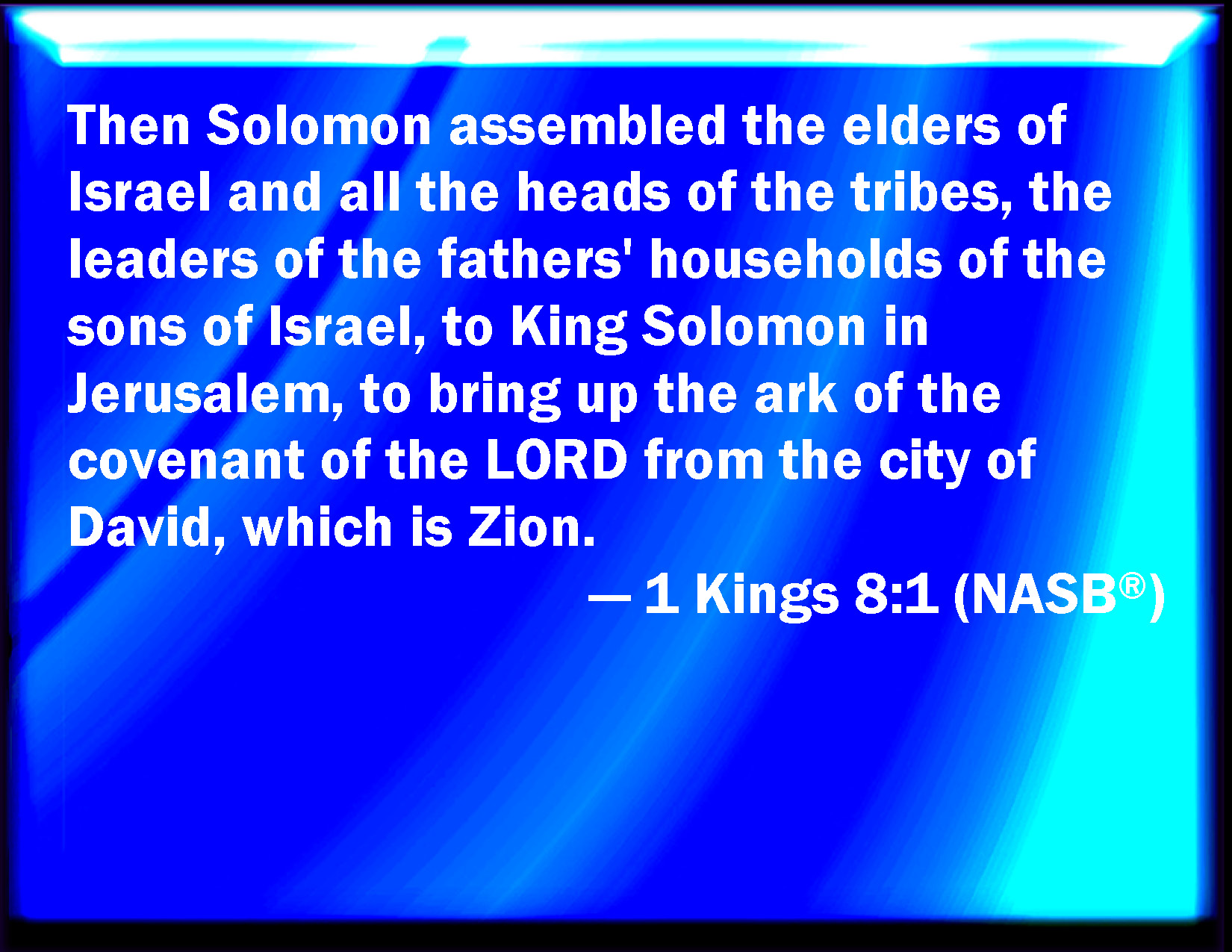 Bible Verse Slide 1 Kings 8:1 Then Solomon assembled the elders of Israel, and all the heads of the tribes, the chief of the fathers of the children of Israel, to king Solomon in Jerusalem, that they might bring up the ark of the covenant of the LORD out of the city of David, which is Zion. KJV: Then Solomon assembled the elders of Israel, and all the heads of the tribes, the chief of the fathers of the children of Israel, unto king Solomon in Jerusalem, that they might bring up the ark of the covenant of the LORD out of the city of David, which is Zion. DRB: Then all the ancients of Israel with the princes of the tribes, and the heads of the families of the children of Israel were assembled to king Solomon in Jerusalem: that they might carry the ark of the covenant of the Lord out of the city of David, that is, out of Sion. DBT: Then Solomon assembled the elders of Israel, and all the heads of the tribes, the princes of the fathers of the children of Israel, unto king Solomon in Jerusalem, to bring up the ark of the covenant of Jehovah out of the city of David, which is Zion. ERV: Then Solomon assembled the elders of Israel, and all the heads of the tribes, the princes of the fathers' houses of the children of Israel, unto king Solomon in Jerusalem, to bring up the ark of the covenant of the LORD out of the city of David, which is Zion. WBT: Then Solomon assembled the elders of Israel, and all the heads of the tribes, the chief of the fathers of the children of Israel, to king Solomon in Jerusalem, that they might bring the ark of the covenant of the LORD out of the city of David, which is Zion. WEB: Then Solomon assembled the elders of Israel, and all the heads of the tribes, the princes of the fathers' [houses] of the children of Israel, to king Solomon in Jerusalem, to bring up the ark of the covenant of Yahweh out of the city of David, which is Zion. YLT: Then doth Solomon assemble the elders of Israel, and all the heads of the tribes, princes of the fathers of the sons of Israel, unto king Solomon, to Jerusalem, to bring up the ark of the covenant of Jehovah from the city of David — it is Zion;Links 1 Kings 8:1 NIV • 1 Kings 8:1 NLT • 1 Kings 8:1 ESV • 1 Kings 8:1 NASB • 1 Kings 8:1 KJV • 1 Kings 8:1 Interlinear • 1 Kings 8:1 Commentaries • 1 Kings 8:1 Parallel Texts • 1 Kings 8:1 Bible Apps • 1 Kings 8:1 Parallel • Bible Hub |