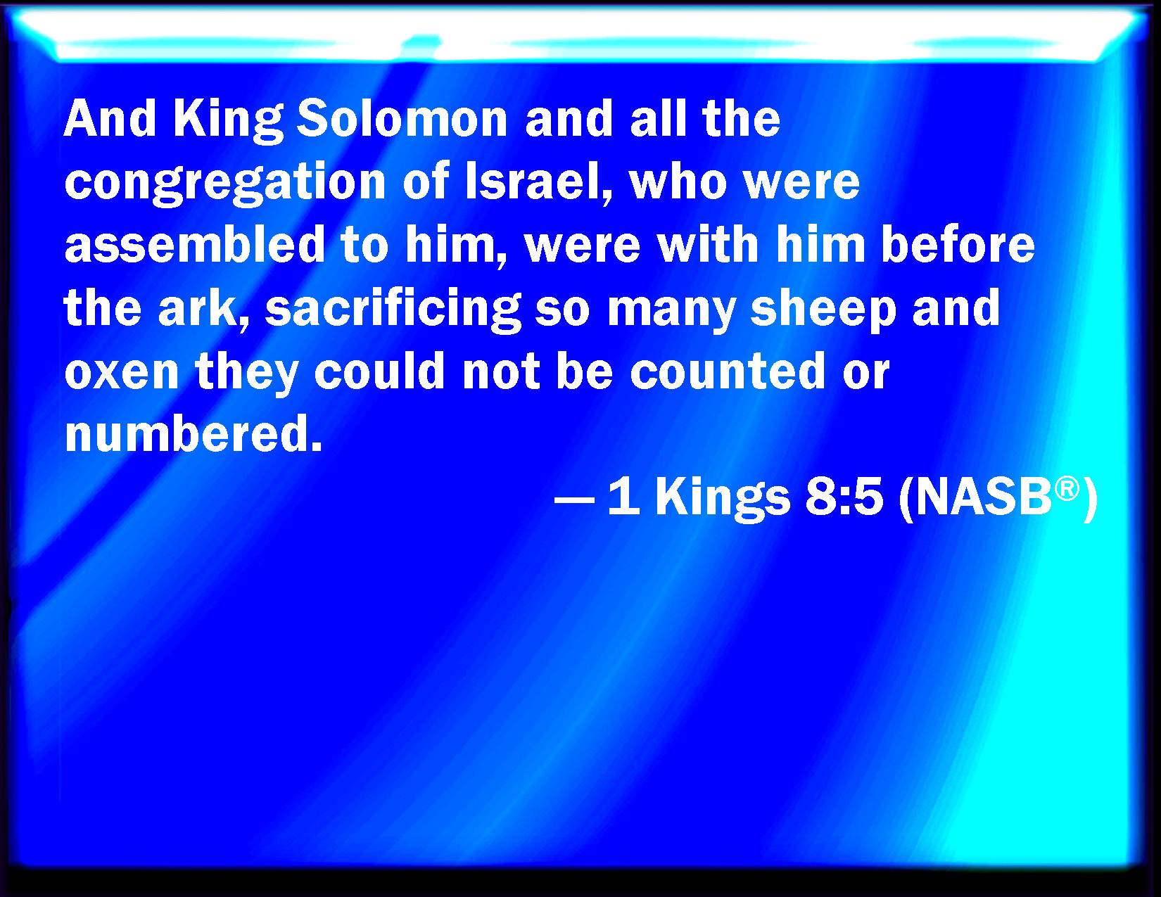 Bible Verse Slide 1 Kings 8:5 And king Solomon, and all the congregation of Israel, that were assembled to him, were with him before the ark, sacrificing sheep and oxen, that could not be told nor numbered for multitude. KJV: And king Solomon, and all the congregation of Israel, that were assembled unto him, were with him before the ark, sacrificing sheep and oxen, that could not be told nor numbered for multitude. DRB: And king Solomon, and all the multitude of Israel, that were assembled unto him went with him before the ark, and they sacrificed sheep and oxen that could not be counted or numbered. DBT: And king Solomon, and all the assembly of Israel that were assembled to him, who were with him before the ark, sacrificed sheep and oxen, which could not be counted nor numbered for multitude. ERV: And king Solomon and all the congregation of Israel, that were assembled unto him, were with him before the ark, sacrificing sheep and oxen, that could not be told nor numbered for multitude. WBT: And king Solomon, and all the congregation of Israel, that were assembled to him, were with him before the ark, sacrificing sheep and oxen, that could not be told nor numbered for multitude. WEB: King Solomon and all the congregation of Israel, who were assembled to him, were with him before the ark, sacrificing sheep and cattle, that could not be counted nor numbered for multitude. YLT: And king Solomon and all the company of Israel who are met unto him are with him before the ark, sacrificing sheep and oxen, that are not counted nor numbered for multitude.Links 1 Kings 8:5 NIV • 1 Kings 8:5 NLT • 1 Kings 8:5 ESV • 1 Kings 8:5 NASB • 1 Kings 8:5 KJV • 1 Kings 8:5 Interlinear • 1 Kings 8:5 Commentaries • 1 Kings 8:5 Parallel Texts • 1 Kings 8:5 Bible Apps • 1 Kings 8:5 Parallel • Bible Hub |