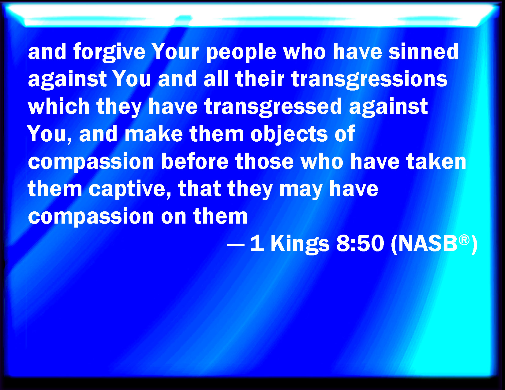 Bible Verse Slide 1 Kings 8:50 And forgive your people that have sinned against you, and all their transgressions wherein they have transgressed against you, and give them compassion before them who carried them captive, that they may have compassion on them: KJV: And forgive thy people that have sinned against thee, and all their transgressions wherein they have transgressed against thee, and give them compassion before them who carried them captive, that they may have compassion on them: DRB: And forgive thy people, that have sinned against thee, and all their iniquities, by which they have transgressed against thee: and give them mercy before them that have made them captives, that they may have compassion on them. DBT: and forgive thy people their sin against thee, and all their transgressions whereby they have transgressed against thee, and give them to find compassion with those who carried them captive, that they may have compassion on them ERV: and forgive thy people which have sinned against thee, and all their transgressions wherein they have transgressed against thee; and give them compassion before those who carried them captive, that they may have compassion on them: WBT: And forgive thy people that have sinned against thee, and all their transgressions in which they have transgressed against thee, and give them compassion before them who carried them captive, that they may have compassion on them: WEB: and forgive your people who have sinned against you, and all their transgressions in which they have transgressed against you; and give them compassion before those who carried them captive, that they may have compassion on them YLT: and hast forgiven Thy people who have sinned against Thee, even all their transgressions which they have transgressed against Thee, and hast given them mercies before their captors, and they have had mercy on them — Links 1 Kings 8:50 NIV • 1 Kings 8:50 NLT • 1 Kings 8:50 ESV • 1 Kings 8:50 NASB • 1 Kings 8:50 KJV • 1 Kings 8:50 Interlinear • 1 Kings 8:50 Commentaries • 1 Kings 8:50 Parallel Texts • 1 Kings 8:50 Bible Apps • 1 Kings 8:50 Parallel • Bible Hub |