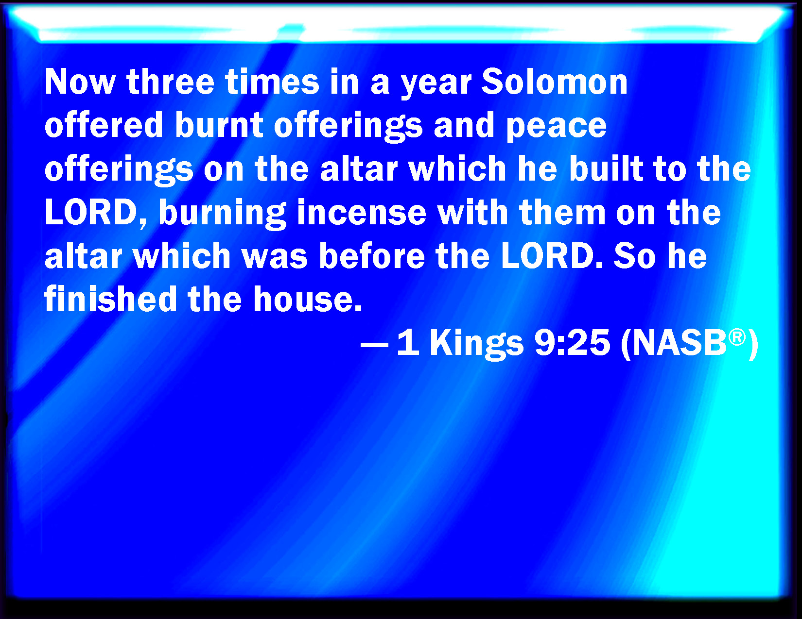 Bible Verse Slide 1 Kings 9:25 And three times in a year did Solomon offer burnt offerings and peace offerings on the altar which he built to the LORD, and he burnt incense on the altar that was before the LORD. So he finished the house. KJV: And three times in a year did Solomon offer burnt offerings and peace offerings upon the altar which he built unto the LORD, and he burnt incense upon the altar that was before the LORD. So he finished the house. DRB: Solomon also offered three times every year holocausts, and victims of peace offerings upon the altar which he had built to the Lord, and he burnt incense before the Lord: and the temple was finished. DBT: And three times in the year did Solomon offer up burnt-offerings and peace-offerings upon the altar that he had built to Jehovah, and he burned incense upon that which was before Jehovah. So he finished the house. ERV: And three times in a year did Solomon offer burnt offerings and peace offerings upon the altar which he built unto the LORD, burning incense therewith, upon the altar that was before the LORD. So he finished the house. WBT: And three times in a year did Solomon offer burnt-offerings and peace-offerings upon the altar which he built to the LORD, and he burnt incense upon the altar that was before the LORD. So he finished the house. WEB: Three times a year did Solomon offer burnt offerings and peace offerings on the altar which he built to Yahweh, burning incense therewith, [on the altar] that was before Yahweh. So he finished the house. YLT: And Solomon caused to ascend, three times in a year, burnt-offerings and peace-offerings on the altar that he built to Jehovah, and he perfumed it with that which is before Jehovah, and finished the house.Links 1 Kings 9:25 NIV • 1 Kings 9:25 NLT • 1 Kings 9:25 ESV • 1 Kings 9:25 NASB • 1 Kings 9:25 KJV • 1 Kings 9:25 Interlinear • 1 Kings 9:25 Commentaries • 1 Kings 9:25 Parallel Texts • 1 Kings 9:25 Bible Apps • 1 Kings 9:25 Parallel • Bible Hub |