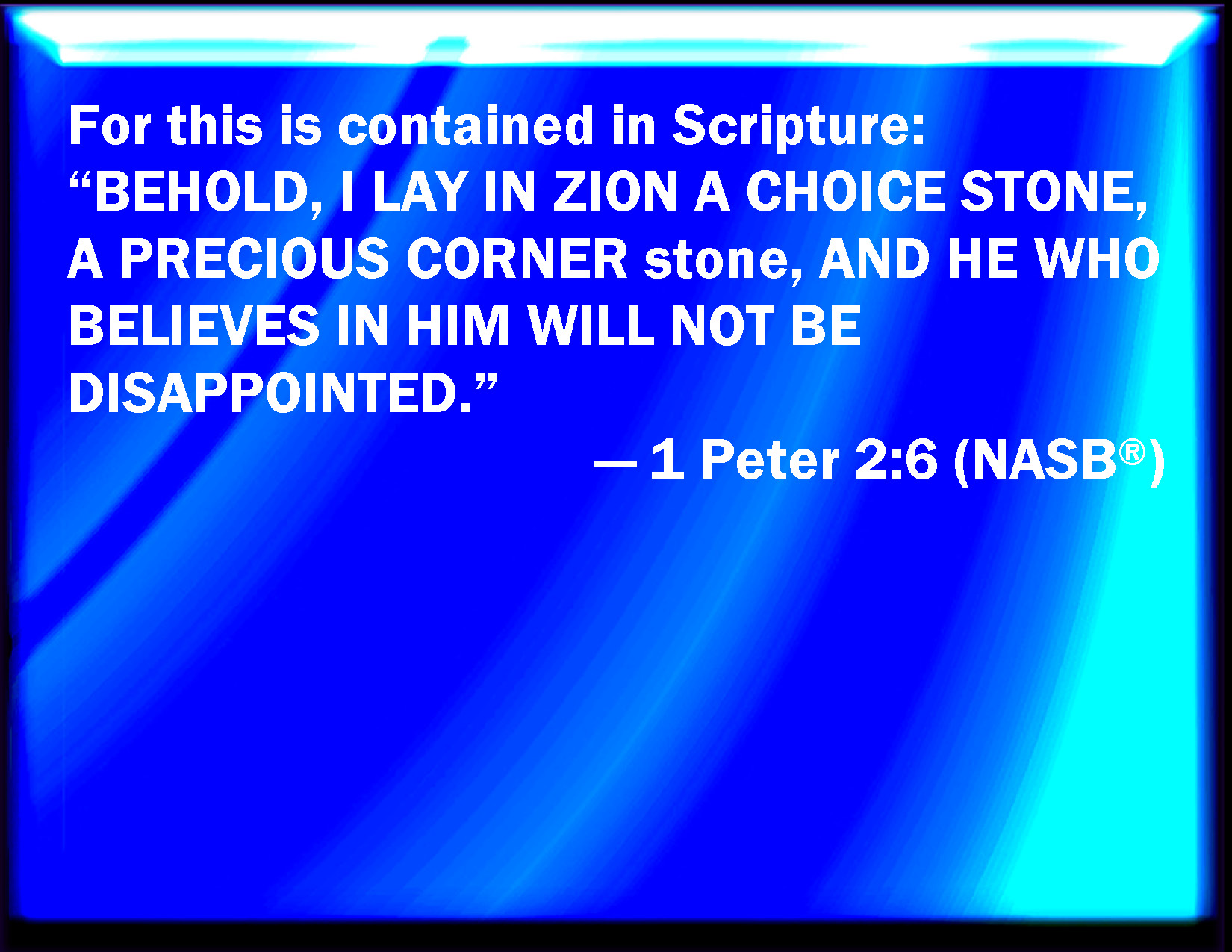 Bible Verse Slide 1 Peter 2:6 Why also it is contained in the scripture, Behold, I lay in Sion a chief corner stone, elect, precious: and he that believes on him shall not be confounded. KJV: Wherefore also it is contained in the scripture, Behold, I lay in Sion a chief corner stone, elect, precious: and he that believeth on him shall not be confounded. DRB: Wherefore it is said in the scripture: Behold, I lay in Sion a chief corner stone, elect, precious. And he that shall believe in him, shall not be confounded. DBT: Because it is contained in the scripture: Behold, I lay in Zion a corner stone, elect, precious: and he that believes on him shall not be put to shame. ERV: Because it is contained in scripture, Behold, I lay in Zion a chief corner stone, elect, precious: And he that believeth on him shall not be put to shame. WBT: Wherefore also it is contained in the scripture, Behold, I lay in Sion a chief corner-stone, elect, precious: and he that believeth on him shall not be confounded. WEB: Because it is contained in Scripture, "Behold, I lay in Zion a chief cornerstone, chosen, and precious: He who believes in him will not be disappointed." YLT: Wherefore, also, it is contained in the Writing: 'Lo, I lay in Zion a chief corner-stone, choice, precious, and he who is believing on him may not be put to shame;'Links 1 Peter 2:6 NIV • 1 Peter 2:6 NLT • 1 Peter 2:6 ESV • 1 Peter 2:6 NASB • 1 Peter 2:6 KJV • 1 Peter 2:6 Interlinear • 1 Peter 2:6 Commentaries • 1 Peter 2:6 Parallel Texts • 1 Peter 2:6 Bible Apps • 1 Peter 2:6 Parallel • Bible Hub |