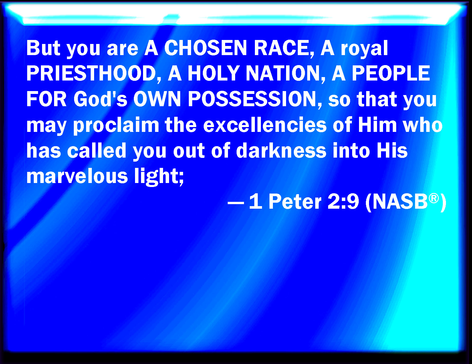 Bible Verse Slide 1 Peter 2:9 But you are a chosen generation, a royal priesthood, an holy nation, a peculiar people; that you should show forth the praises of him who has called you out of darkness into his marvelous light; KJV: But ye are a chosen generation, a royal priesthood, an holy nation, a peculiar people; that ye should shew forth the praises of him who hath called you out of darkness into his marvellous light: DRB: But you are a chosen generation, a kingly priesthood, a holy nation, a purchased people: that you may declare his virtues, who hath called you out of darkness into his marvellous light: DBT: But ye are a chosen race, a kingly priesthood, a holy nation, a people for a possession, that ye might set forth the excellencies of him who has called you out of darkness to his wonderful light; ERV: But ye are an elect race, a royal priesthood, a holy nation, a people for God's own possession, that ye may shew forth the excellencies of him who called you out of darkness into his marvelous light: WBT: But ye are a chosen generation, a royal priesthood, a holy nation, a peculiar people; that ye should show forth the praises of him who hath called you out of darkness into his marvelous light: WEB: But you are a chosen race, a royal priesthood, a holy nation, a people for God's own possession, that you may proclaim the excellence of him who called you out of darkness into his marvelous light: YLT: and ye are a choice race, a royal priesthood, a holy nation, a people acquired, that the excellences ye may shew forth of Him who out of darkness did call you to His wondrous light;Links 1 Peter 2:9 NIV • 1 Peter 2:9 NLT • 1 Peter 2:9 ESV • 1 Peter 2:9 NASB • 1 Peter 2:9 KJV • 1 Peter 2:9 Interlinear • 1 Peter 2:9 Commentaries • 1 Peter 2:9 Parallel Texts • 1 Peter 2:9 Bible Apps • 1 Peter 2:9 Parallel • Bible Hub |