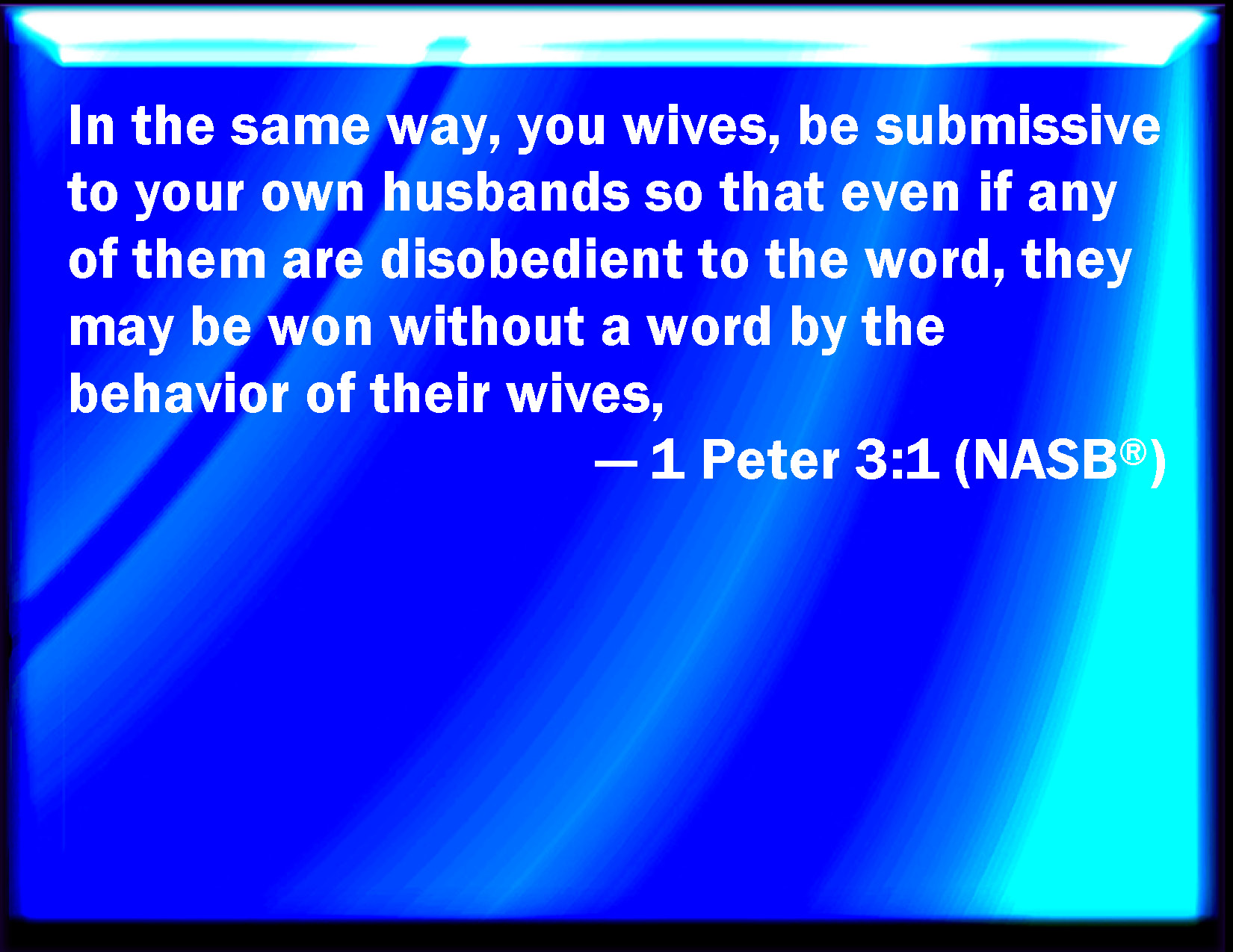 Bible Verse Slide 1 Peter 3:1 Likewise, you wives, be in subjection to your own husbands; that, if any obey not the word, they also may without the word be won by the conversation of the wives; KJV: Likewise, ye wives, be in subjection to your own husbands; that, if any obey not the word, they also may without the word be won by the conversation of the wives; DRB: In like manner also let wives be subject to their husbands: that if any believe not the word, they may be won without the word, by the conversation of the wives. DBT: Likewise, wives, be subject to your own husbands, that, even if any are disobedient to the word, they may be gained without the word by the conversation of the wives, ERV: In like manner, ye wives, be in subjection to your own husbands; that, even if any obey not the word, they may without the word be gained by the behaviour of their wives; WBT: Likewise, ye wives, be in subjection to your own husbands; that, if any obey not the word, they also may without the word be won by the deportment of the wives; WEB: In the same way, wives, be in subjection to your own husbands; so that, even if any don't obey the Word, they may be won by the behavior of their wives without a word; YLT: In like manner, the wives, be ye subject to your own husbands, that even if certain are disobedient to the word, through the conversation of the wives, without the word, they may be won,Links 1 Peter 3:1 NIV • 1 Peter 3:1 NLT • 1 Peter 3:1 ESV • 1 Peter 3:1 NASB • 1 Peter 3:1 KJV • 1 Peter 3:1 Interlinear • 1 Peter 3:1 Commentaries • 1 Peter 3:1 Parallel Texts • 1 Peter 3:1 Bible Apps • 1 Peter 3:1 Parallel • Bible Hub |